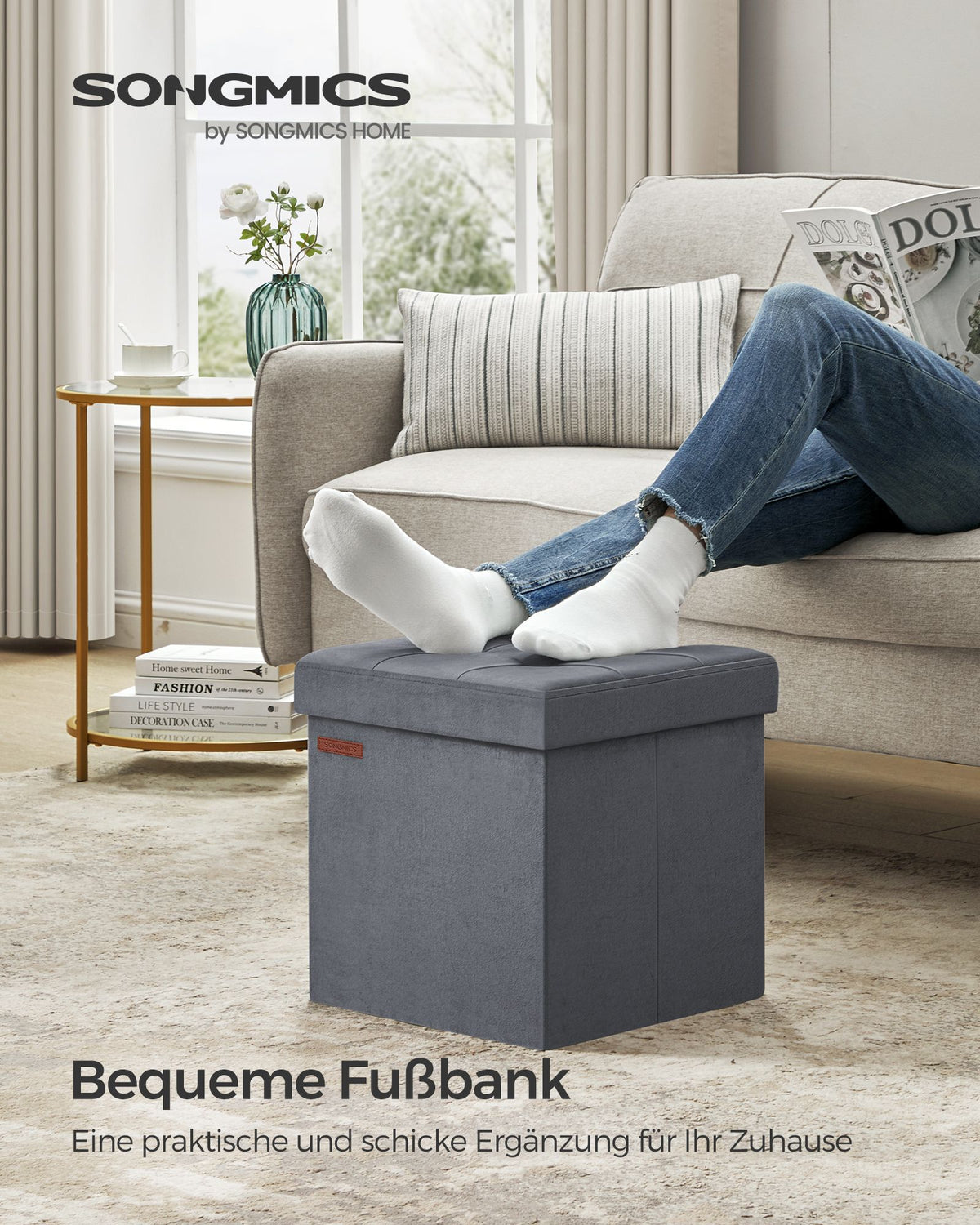 Bank met opbergruimte van leigrijs fluweel 38 x 38 x 38 cm