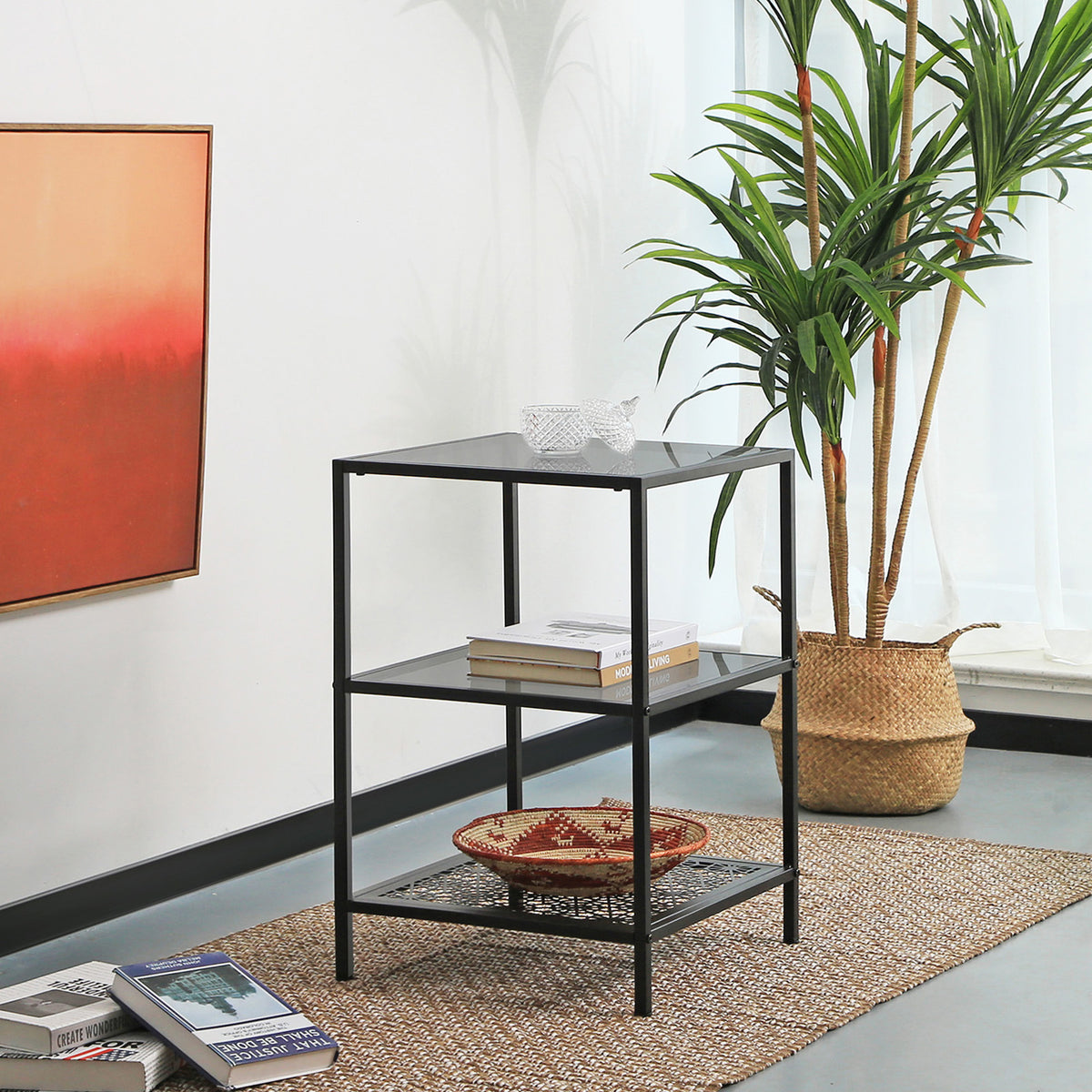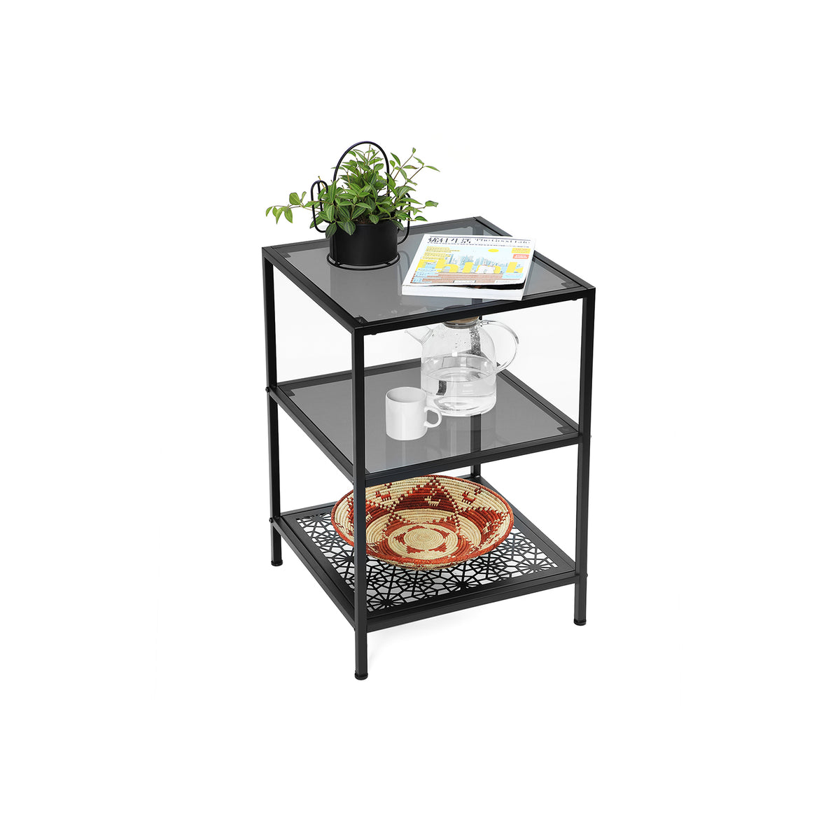 Bijzettafel met 2 glazen planken 43,4 x 43,4 x 66,6 cm