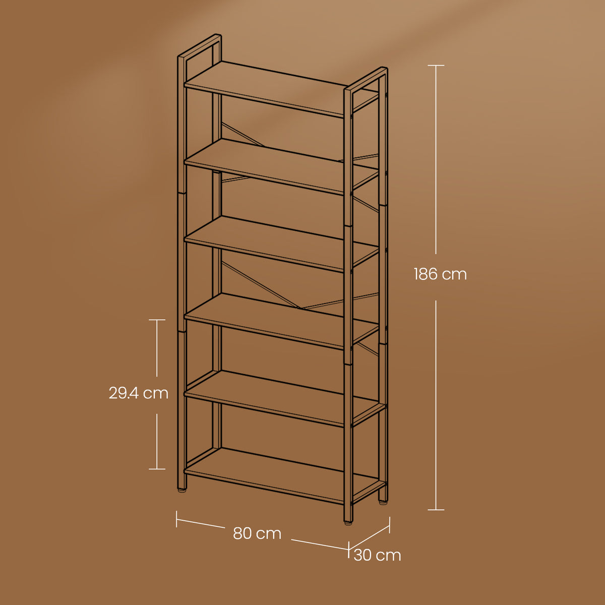 Boekenplank 6 niveaus, staande plank met stalen frame, vrijstaande plank 80 x 30 x 186 cm