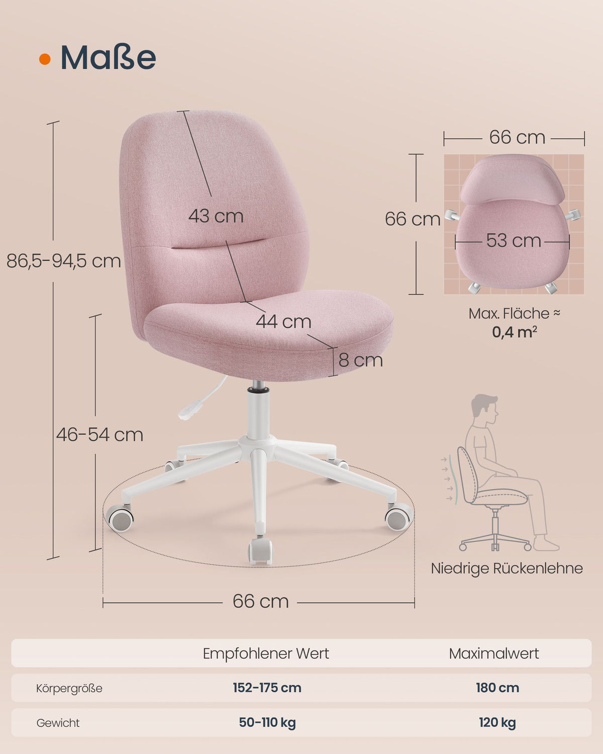 Bureaustoel met onderstel en schommelfunctie pastelroze 54 cm