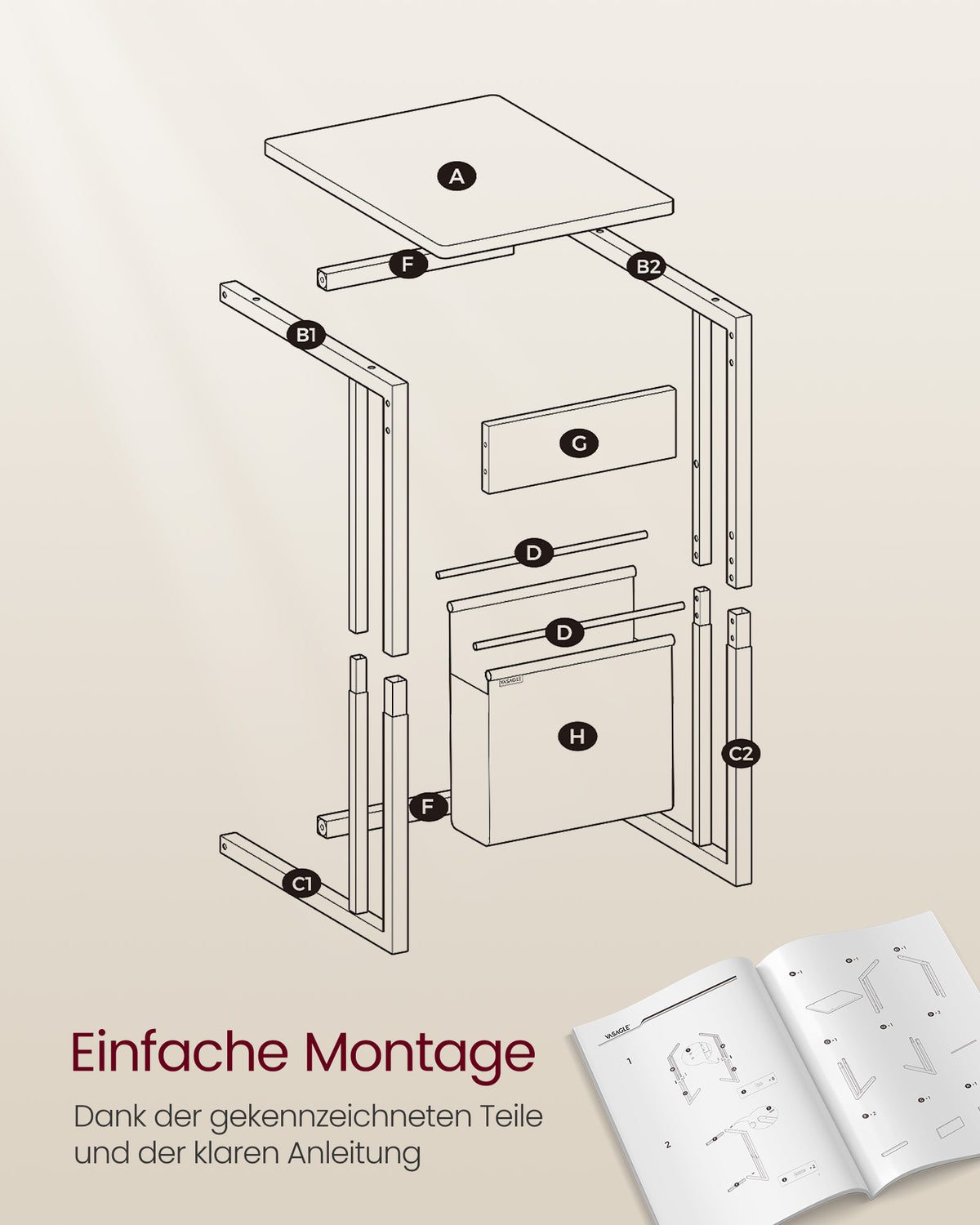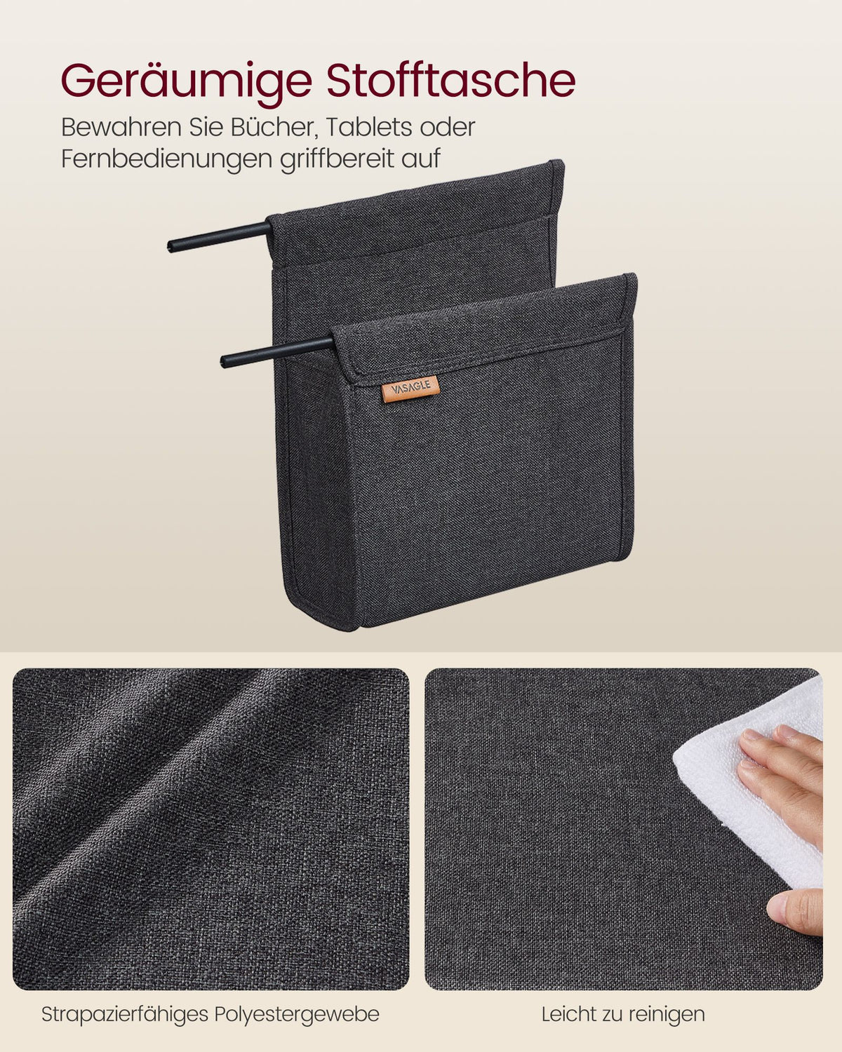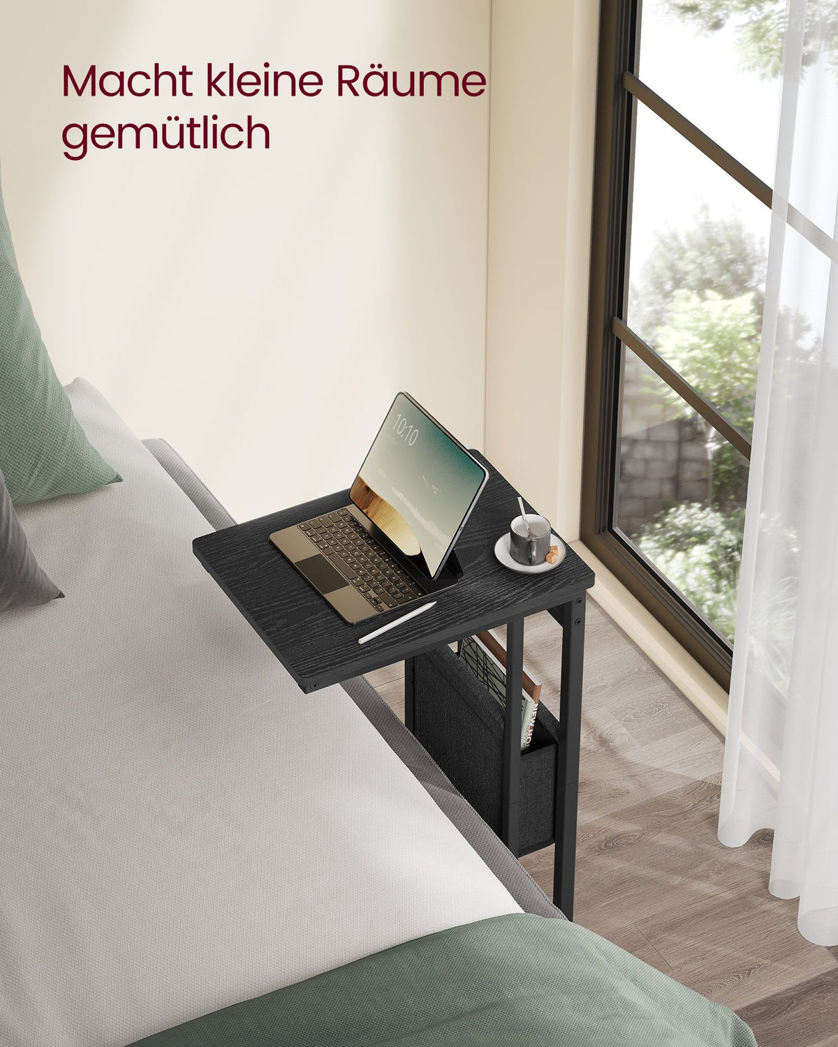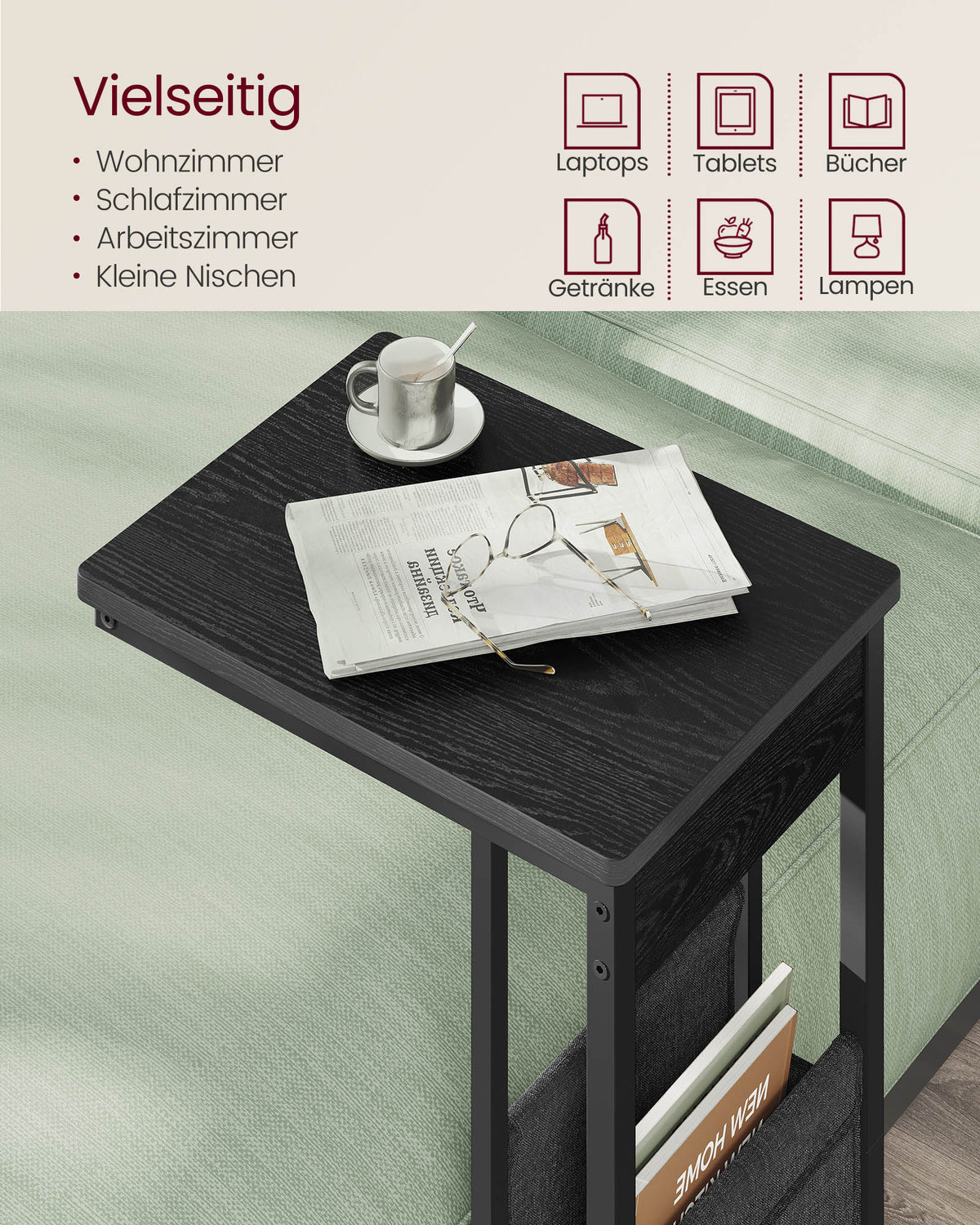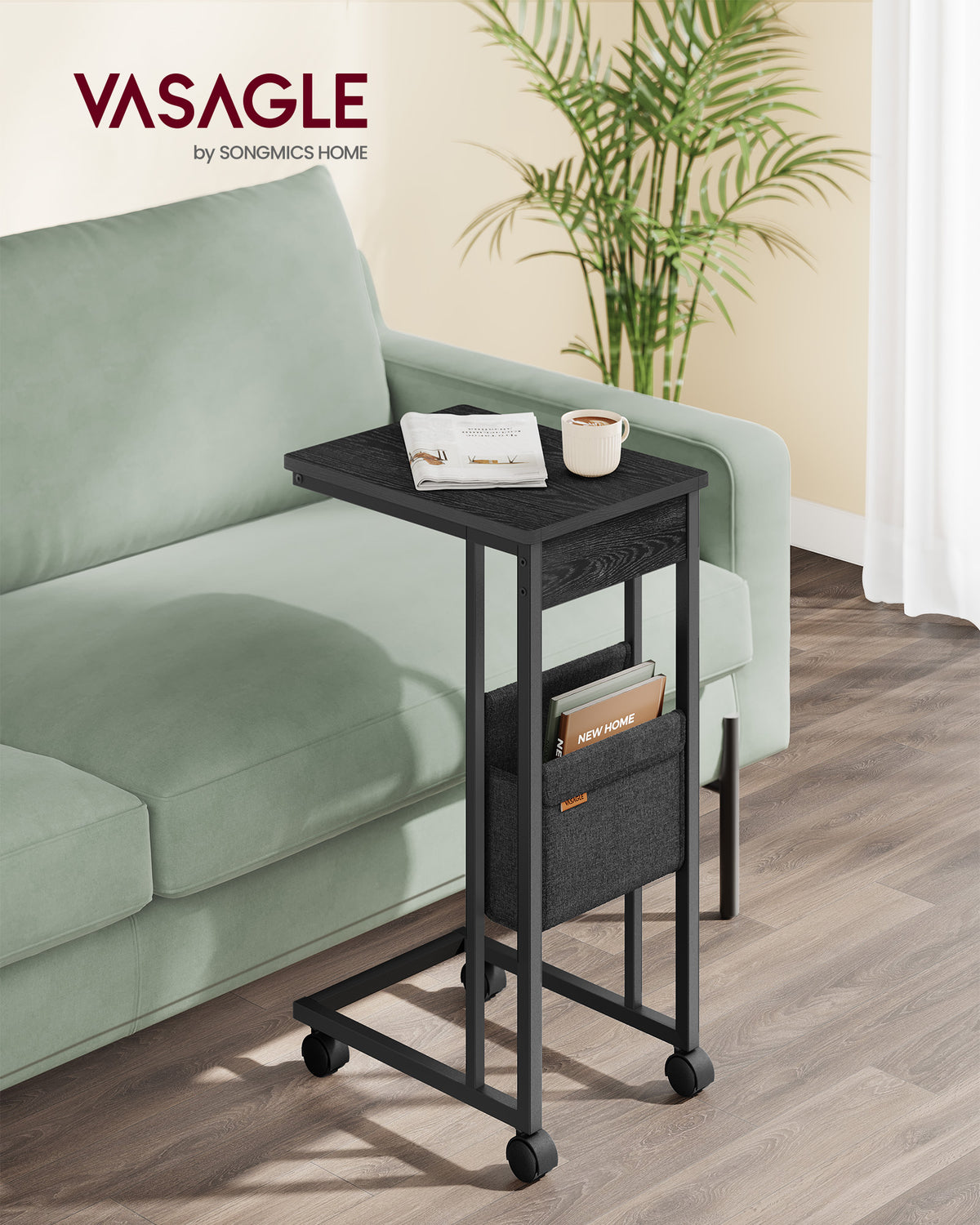 C-vormige bijzettafel met opbergtas, ebbenhoutzwart 30 x 40 x 62 cm