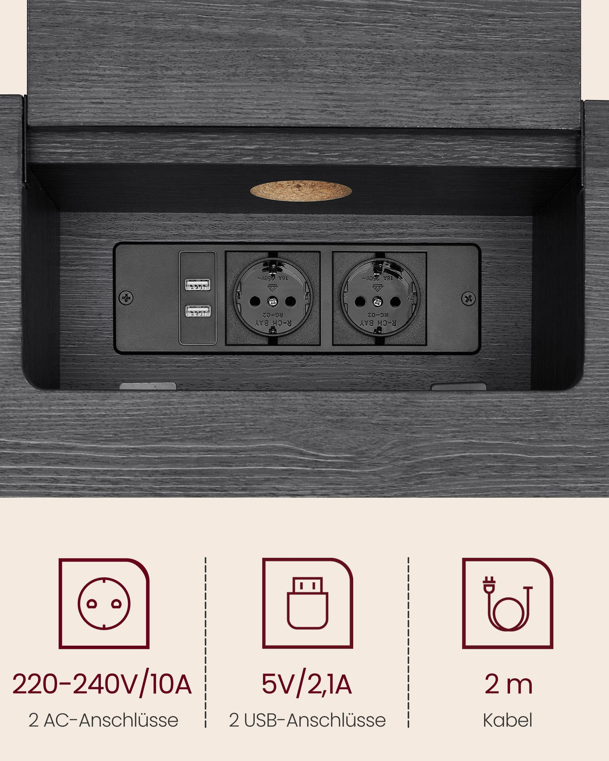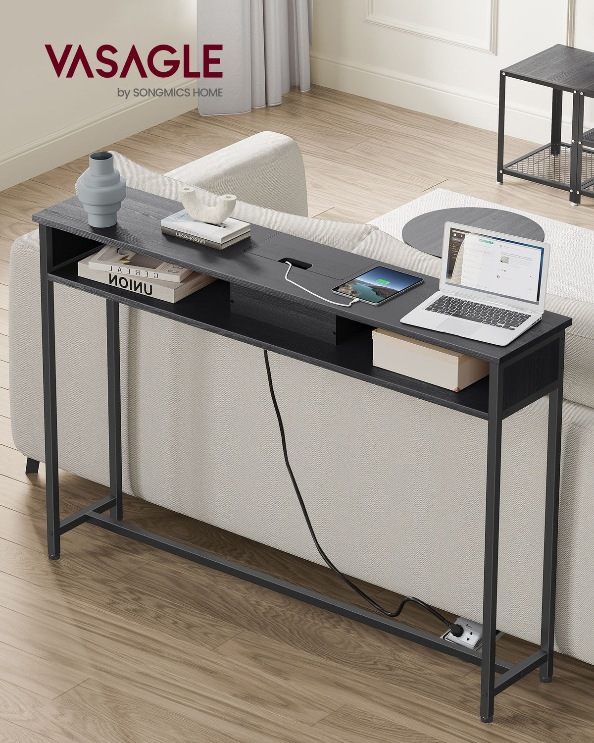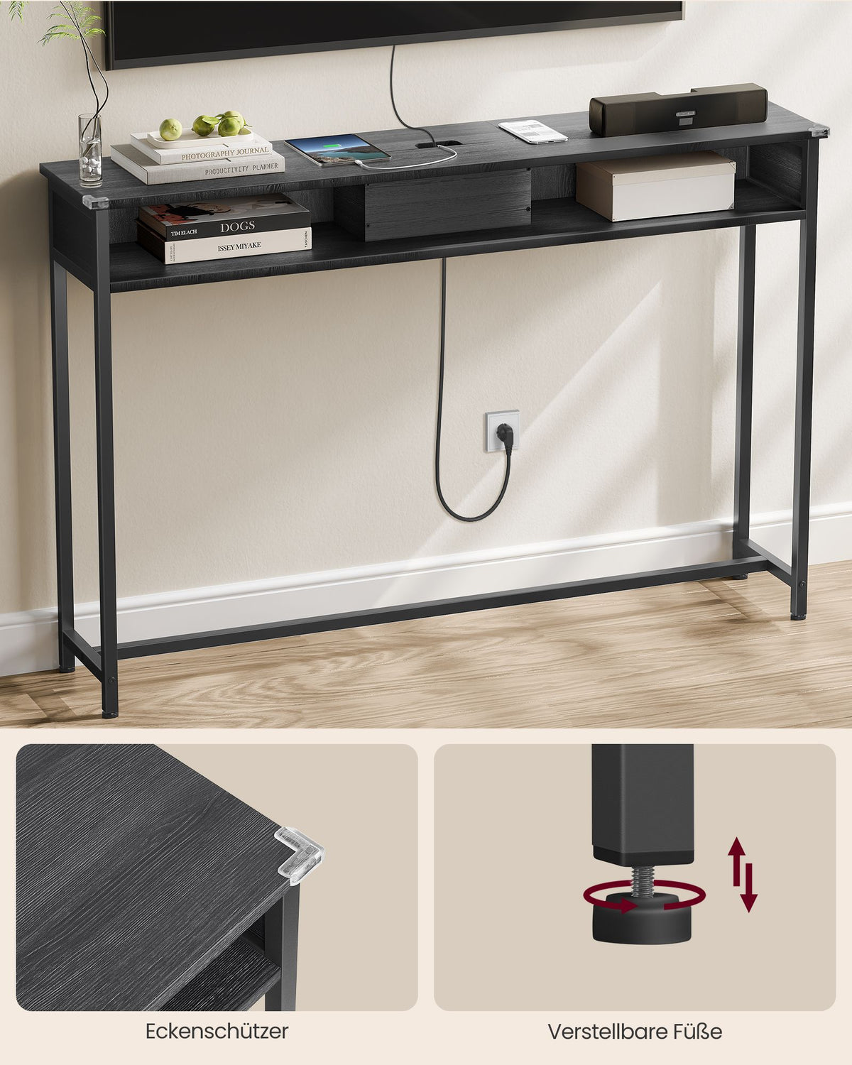 Consoletafel met stopcontacten, smal, antracietgrijs-inktzwart 1 cm