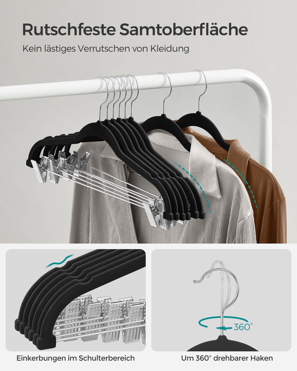 Fluwelen kledinghangers set van 10 met verstelbare clips, zwart 5 cm