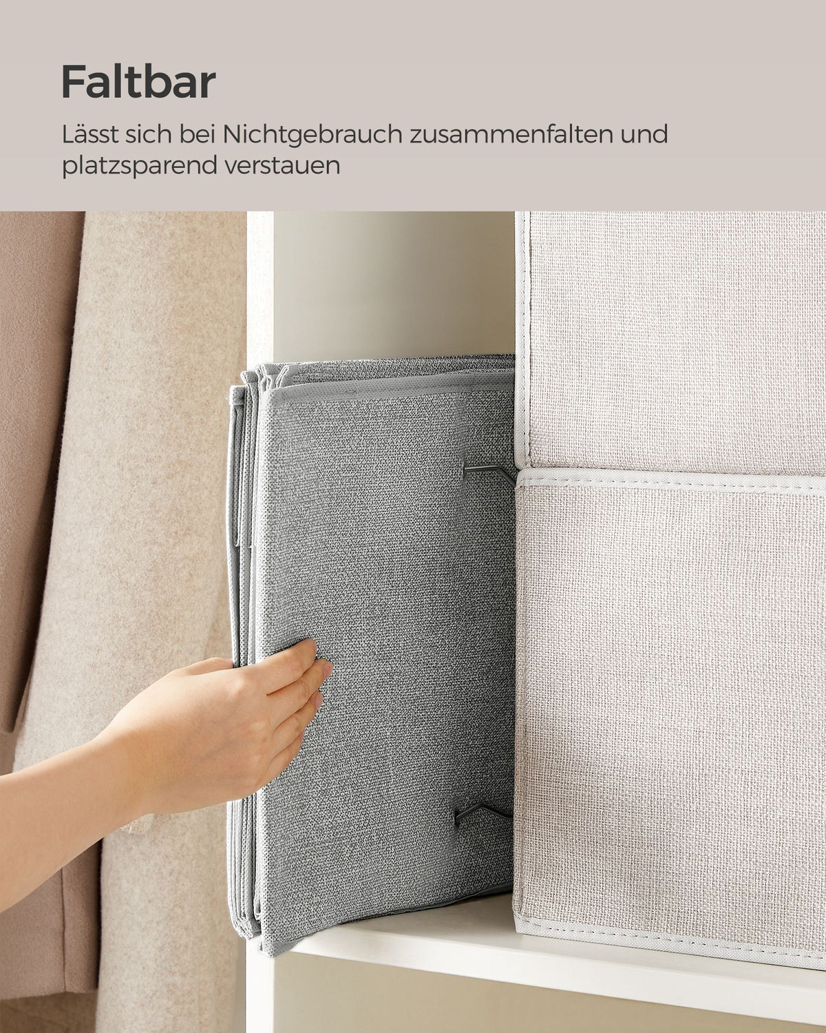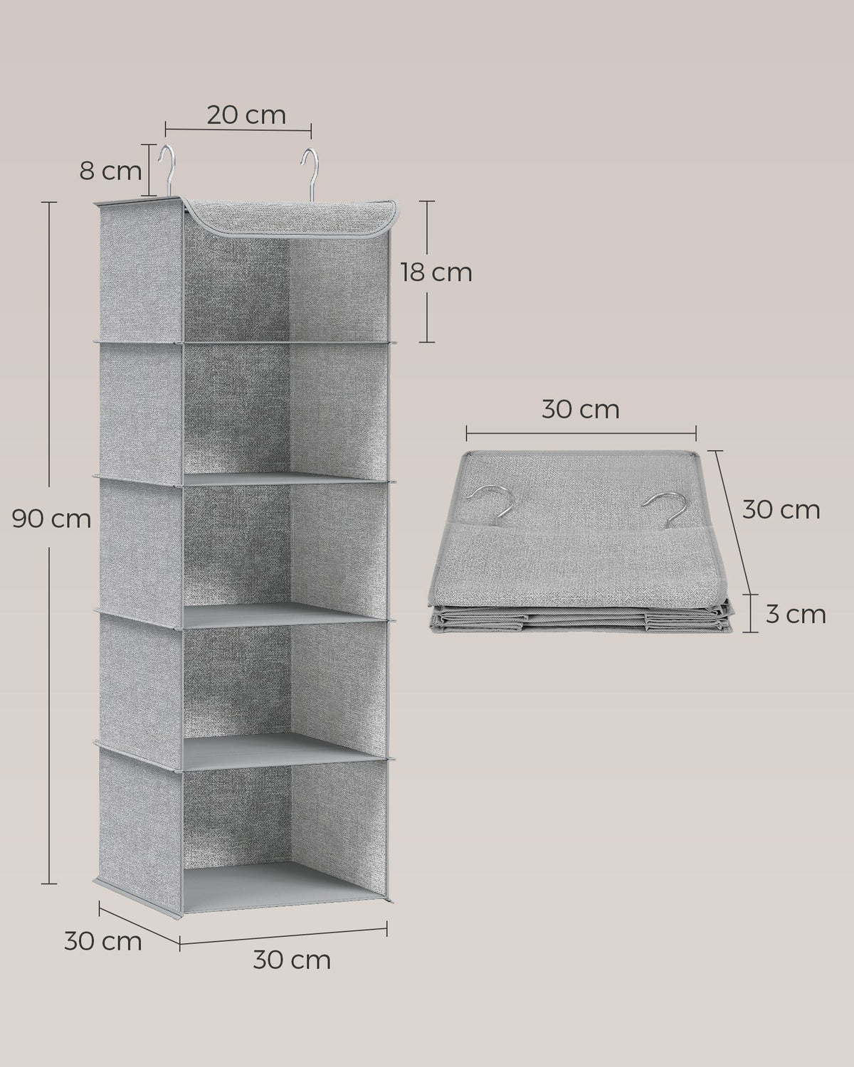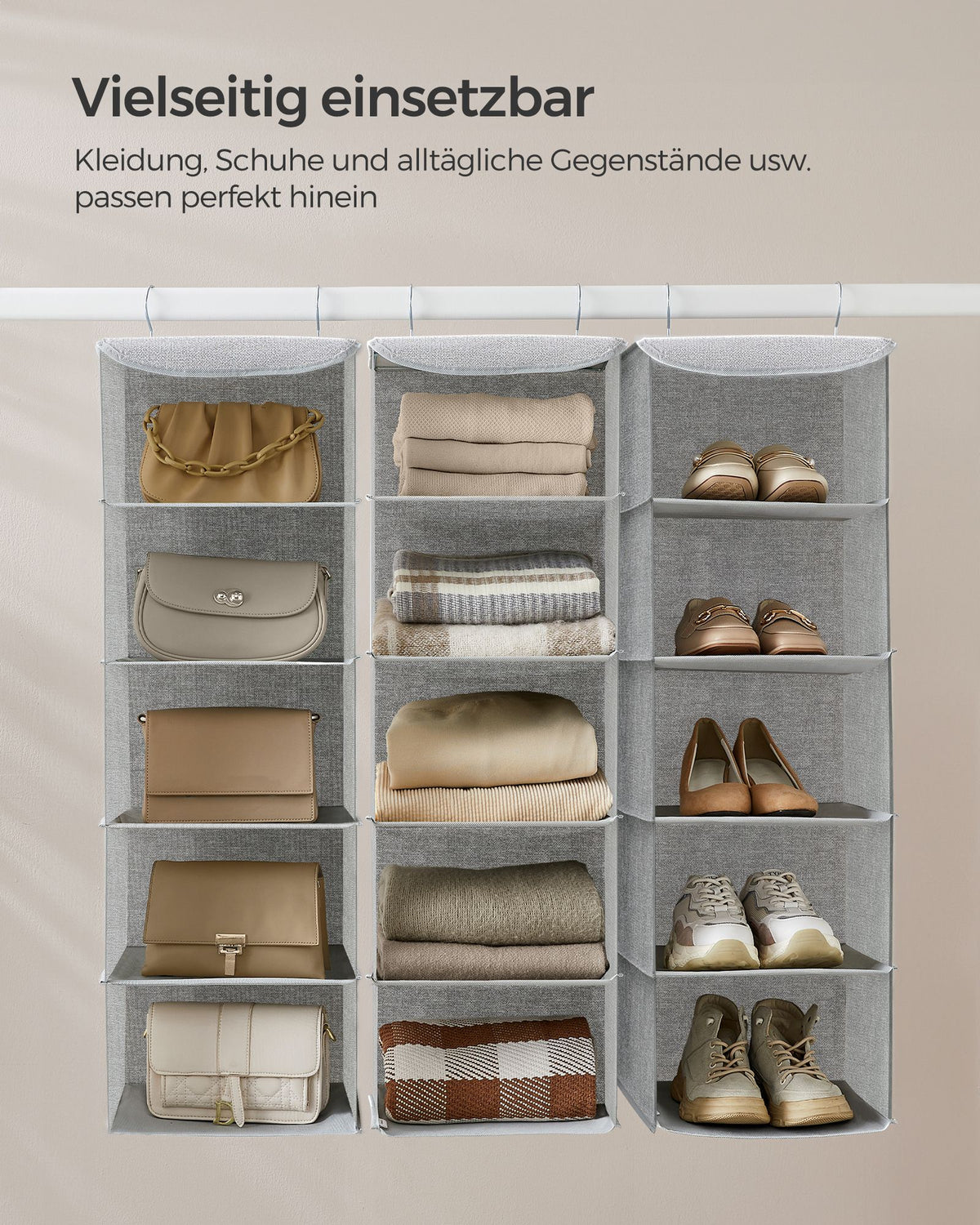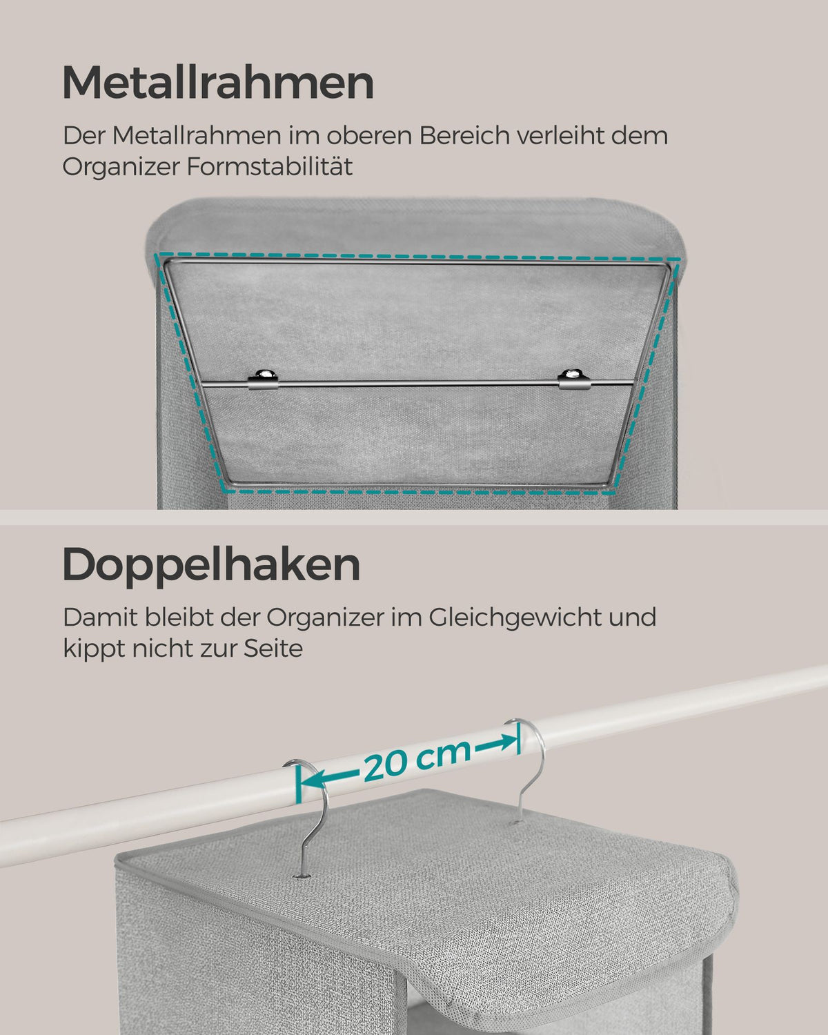 Hangende organizer set van 2 met metalen haken, lichtgrijs 30 x 30 x 90 cm