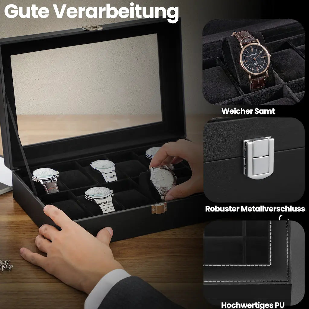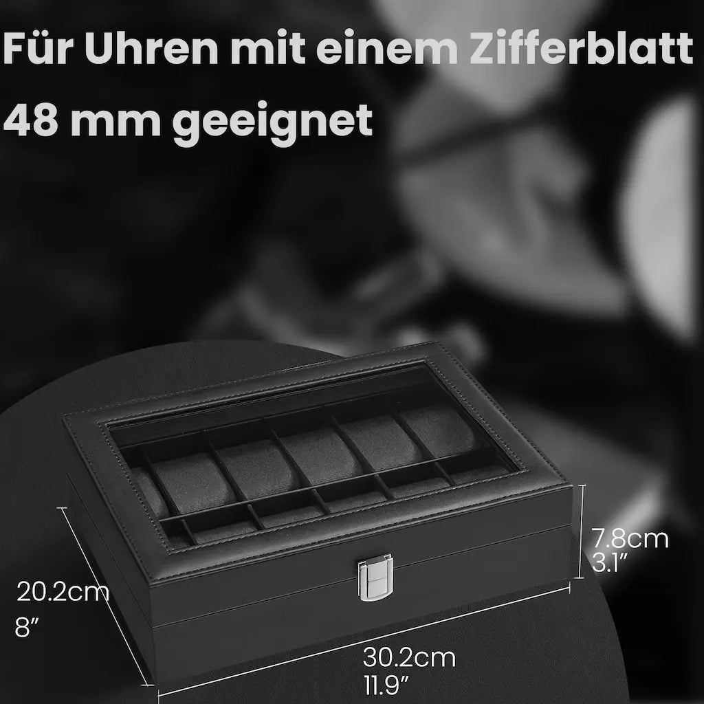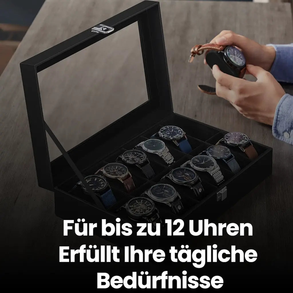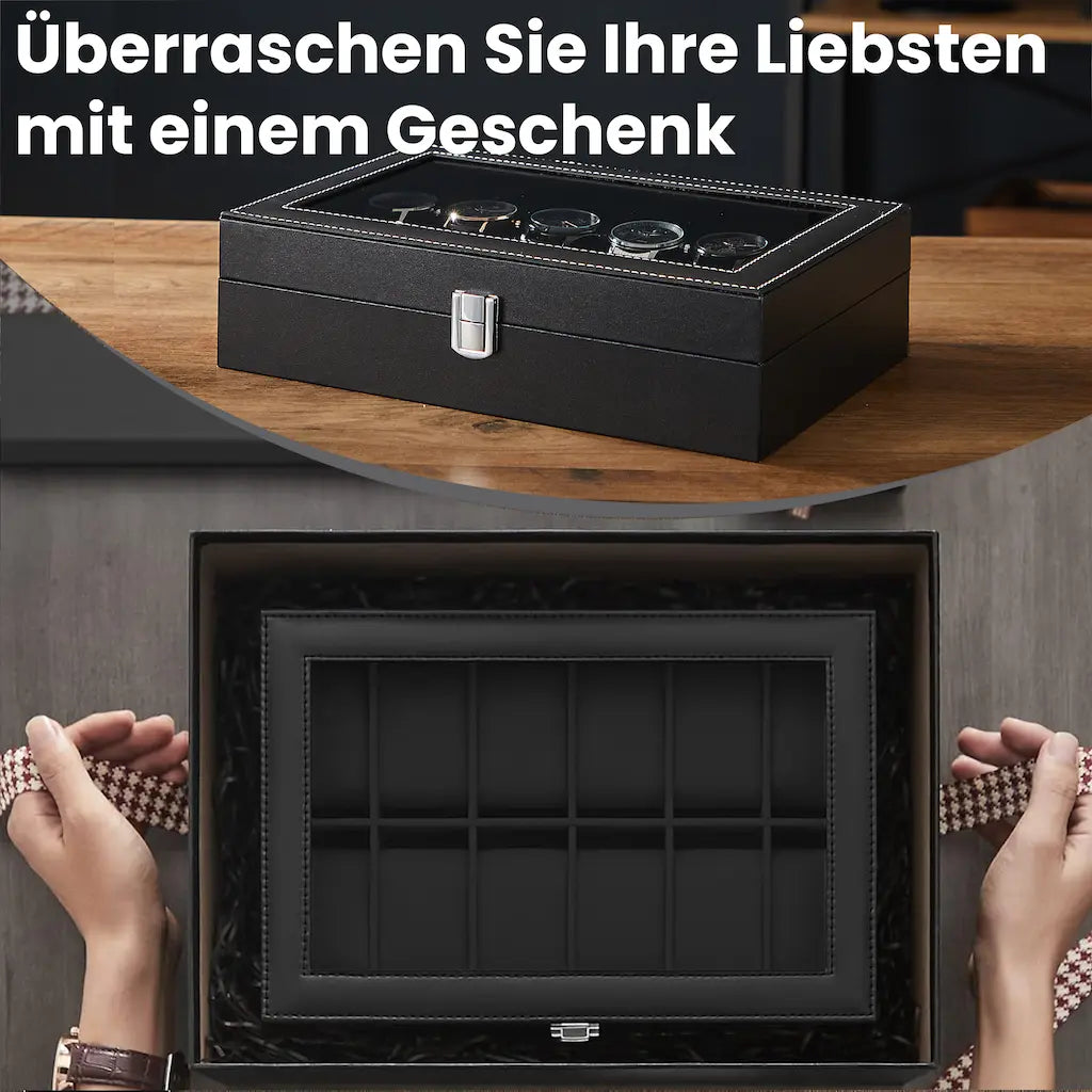 Horlogebox met 12 compartimenten, horlogekast, glazen deksel 30 x 21 x 8,5 cm