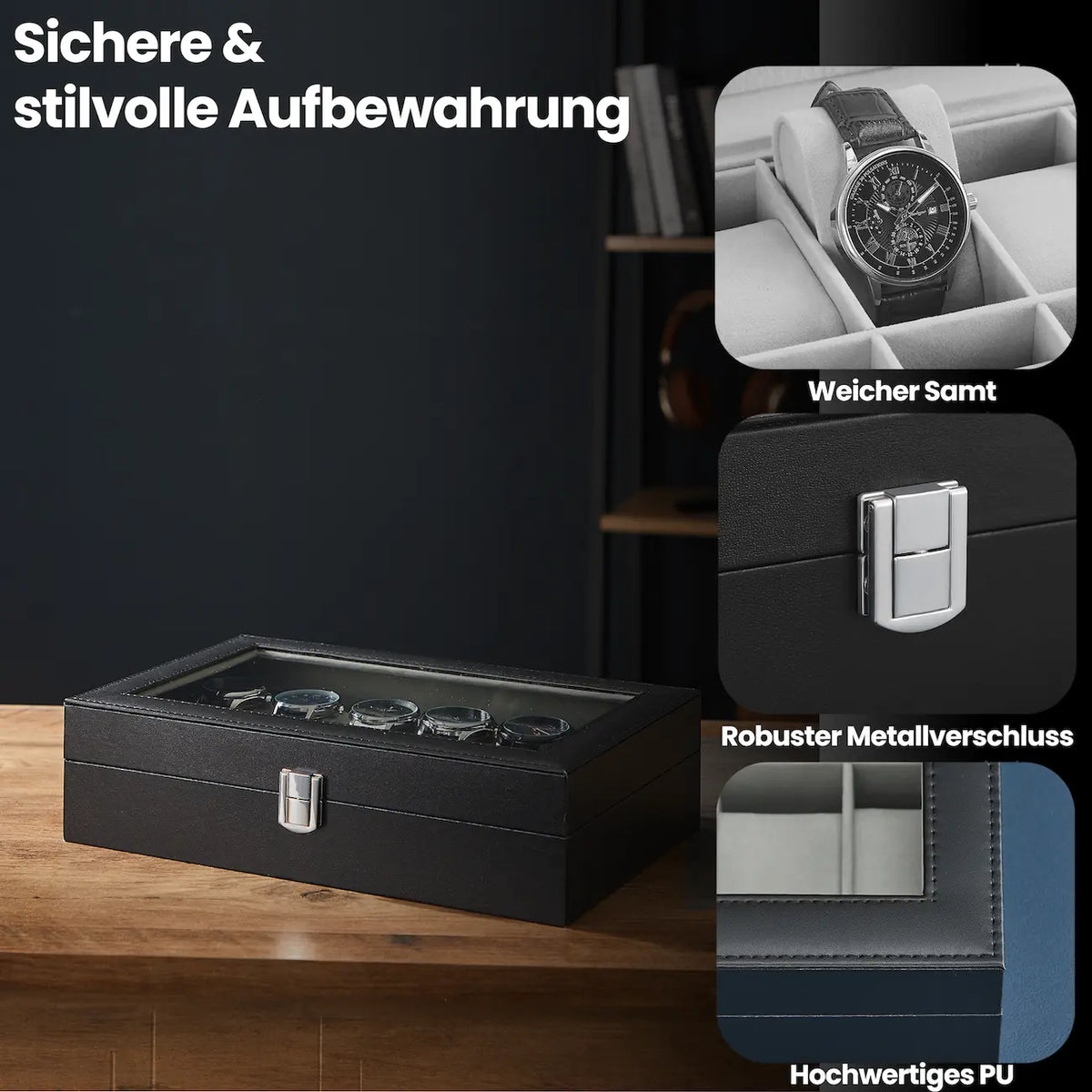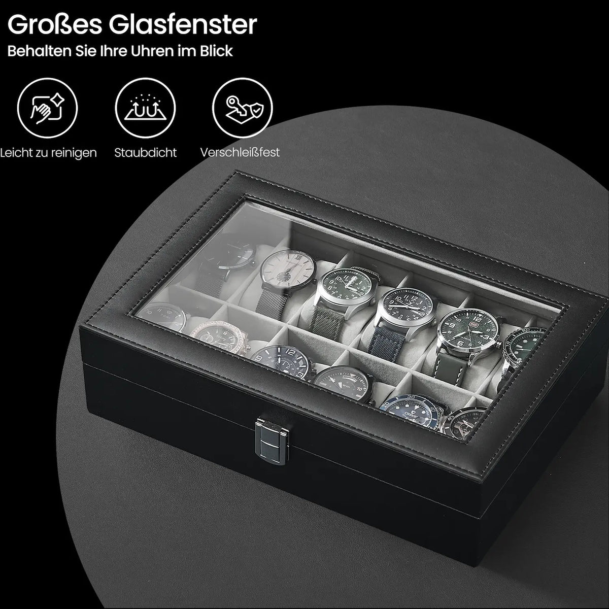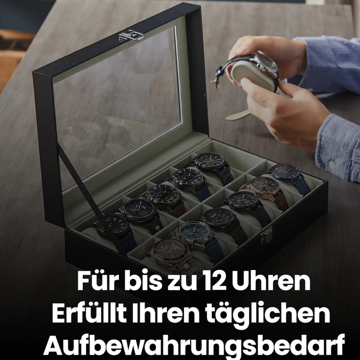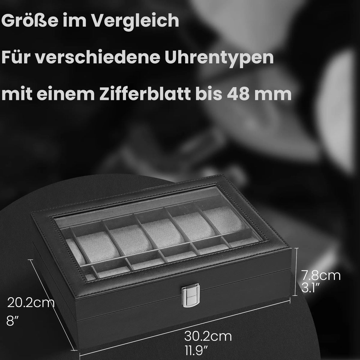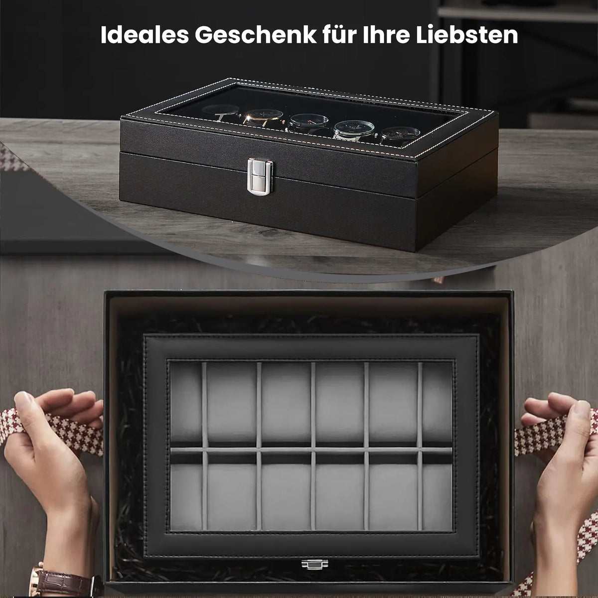Horlogebox met 12 compartimenten, horlogekast, glazen deksel, 32 x 18,6 x 8,5 cm