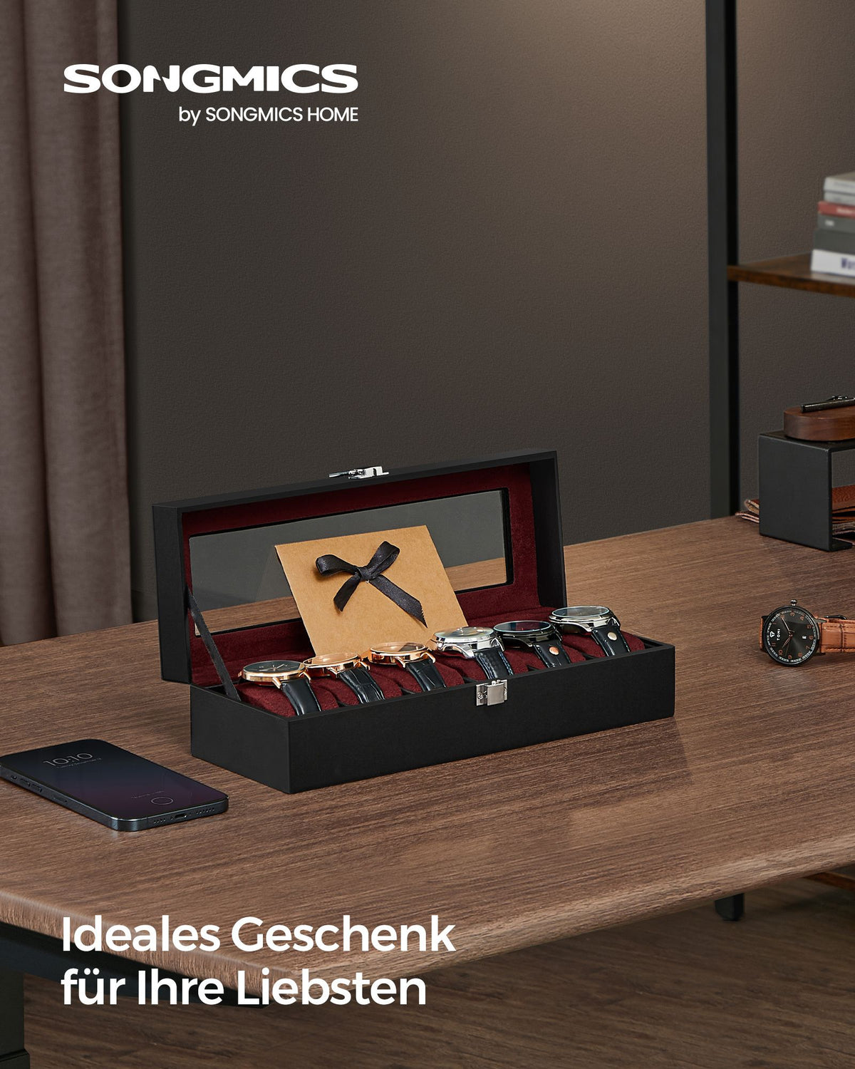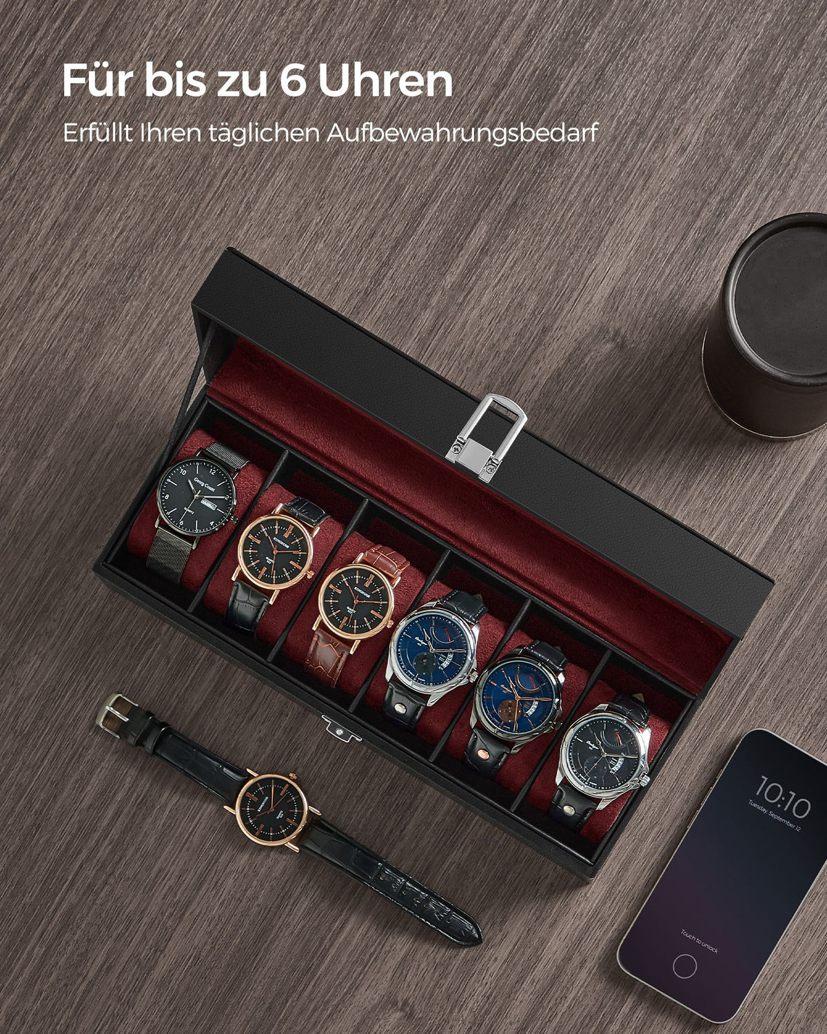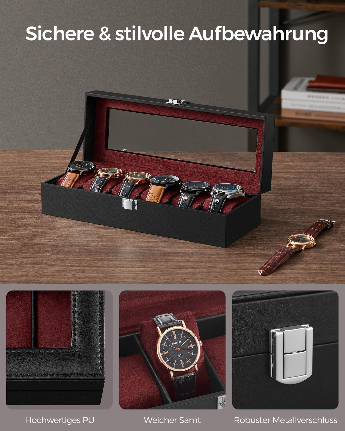 Horlogebox met 6 compartimenten, glazen deksel, metalen sluiting, zwart 30 x 11 x 8 cm