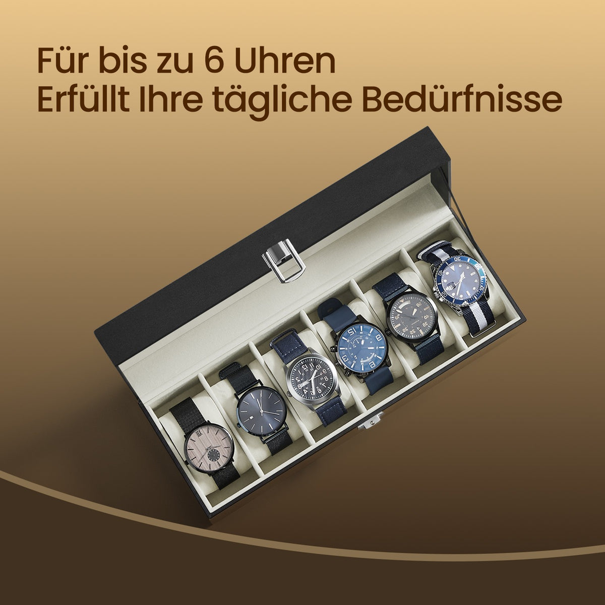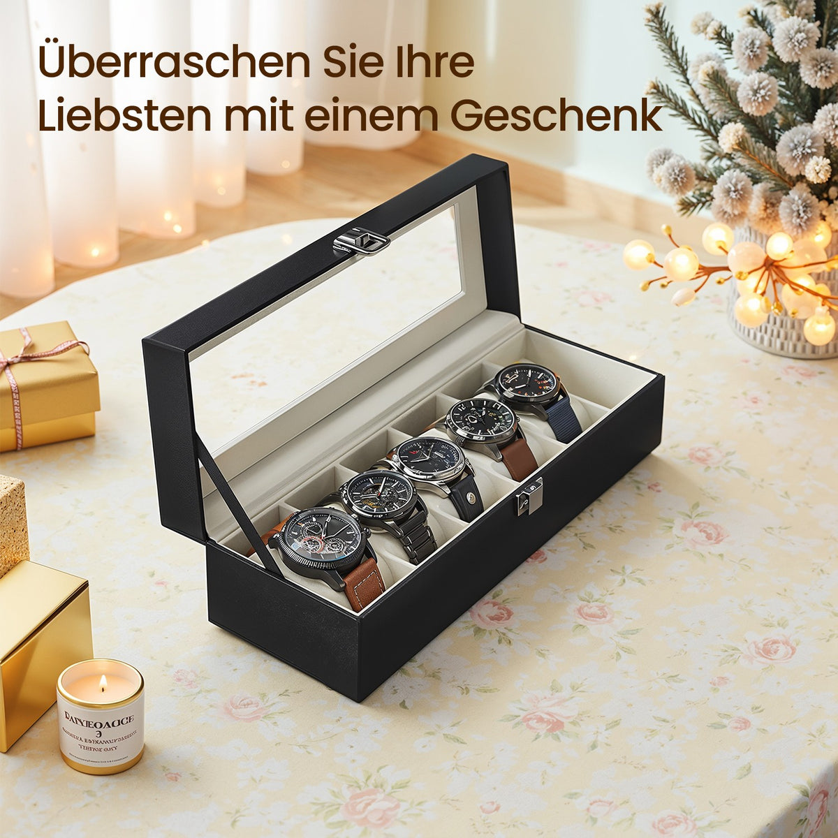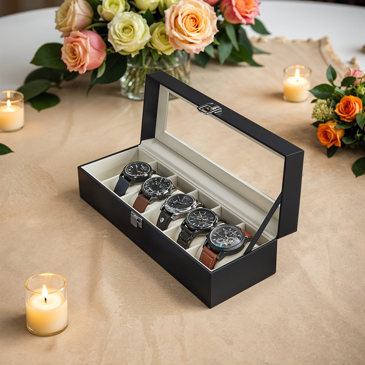 Horlogebox met 6 compartimenten, horlogekast, glazen deksel 30 x 11,2 x 8 cm - JWBB3506BE