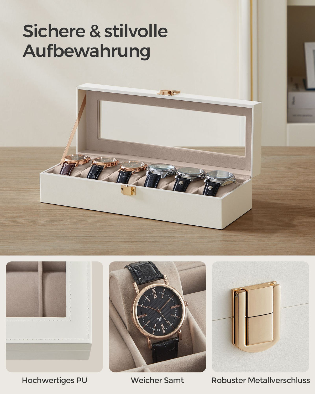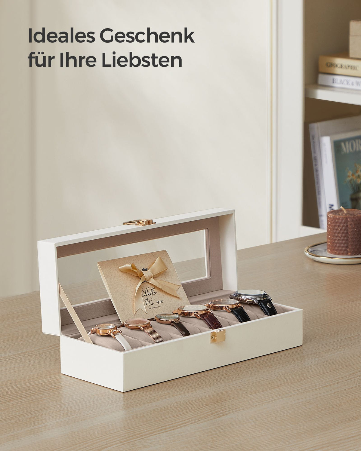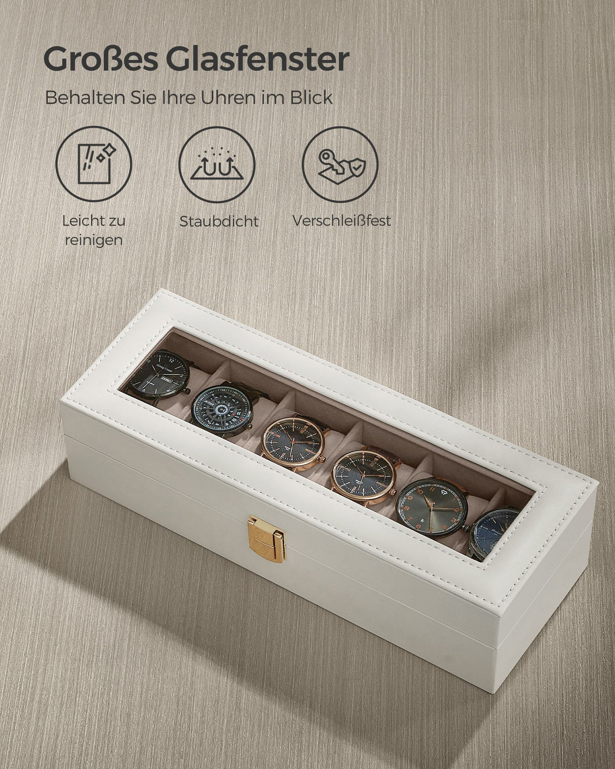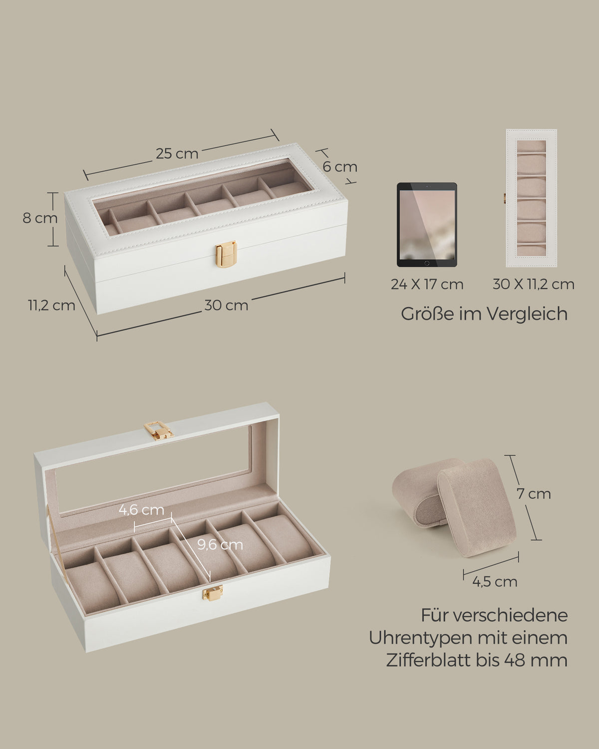Horlogebox met 6 compartimenten, metalen sluiting, cadeau-idee, wolkenwit 30 x 11 x 8 cm