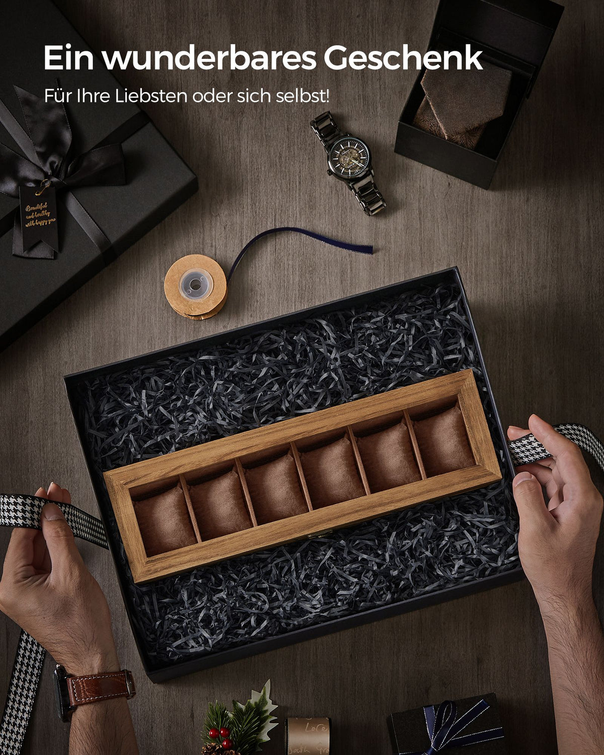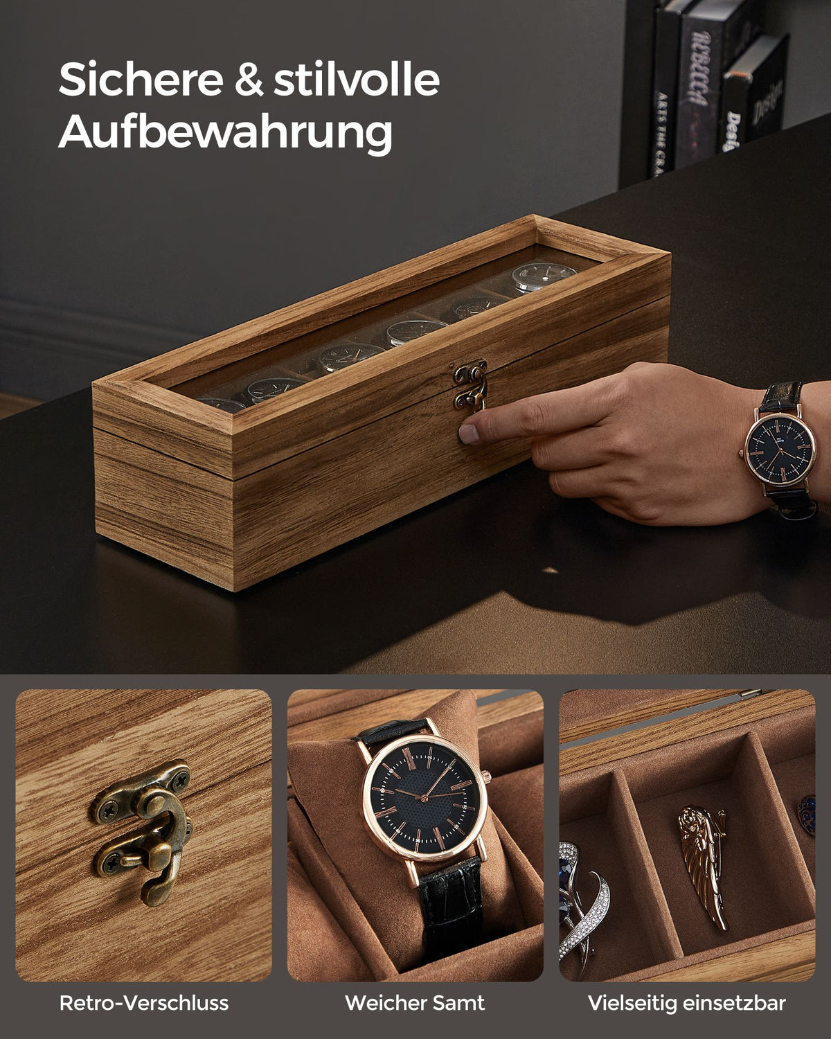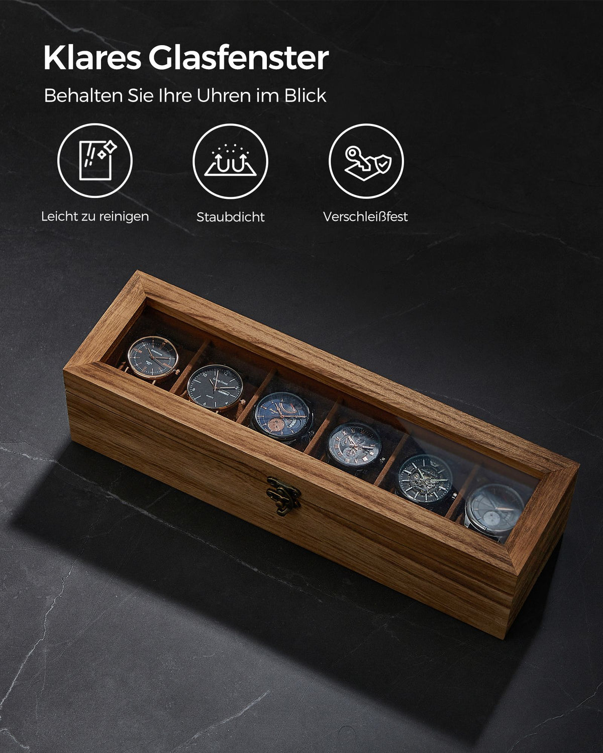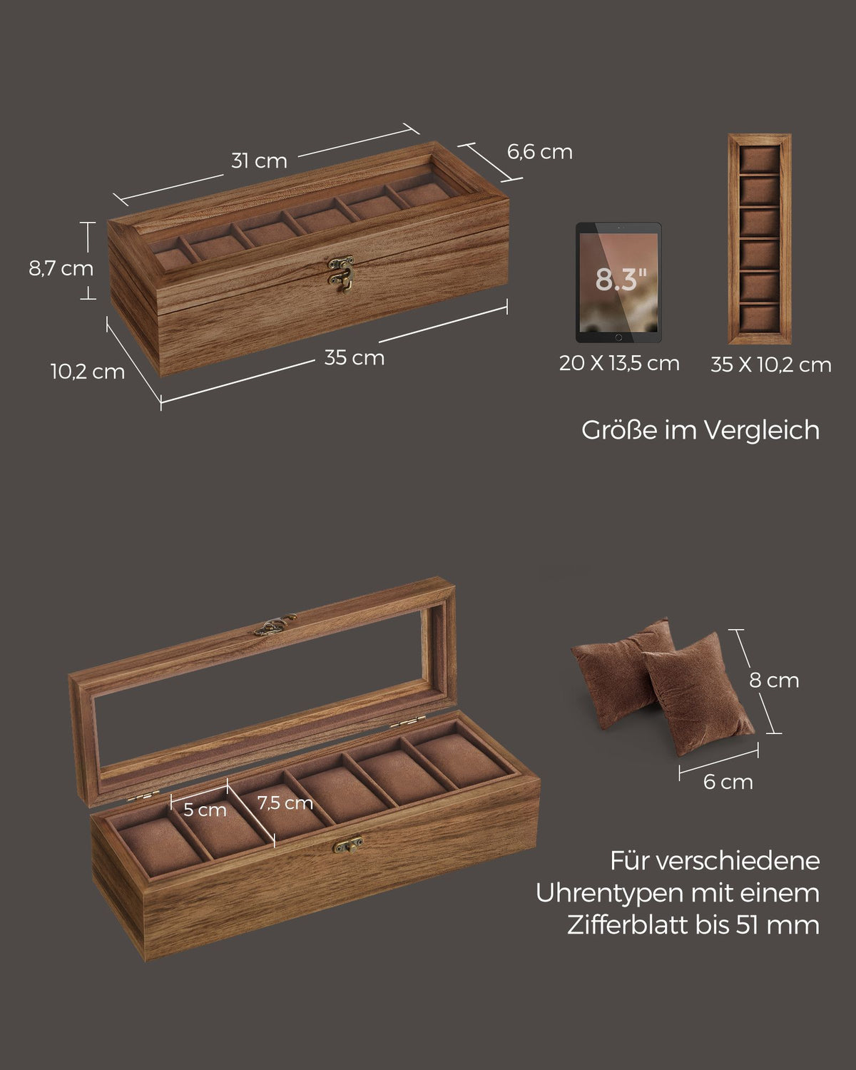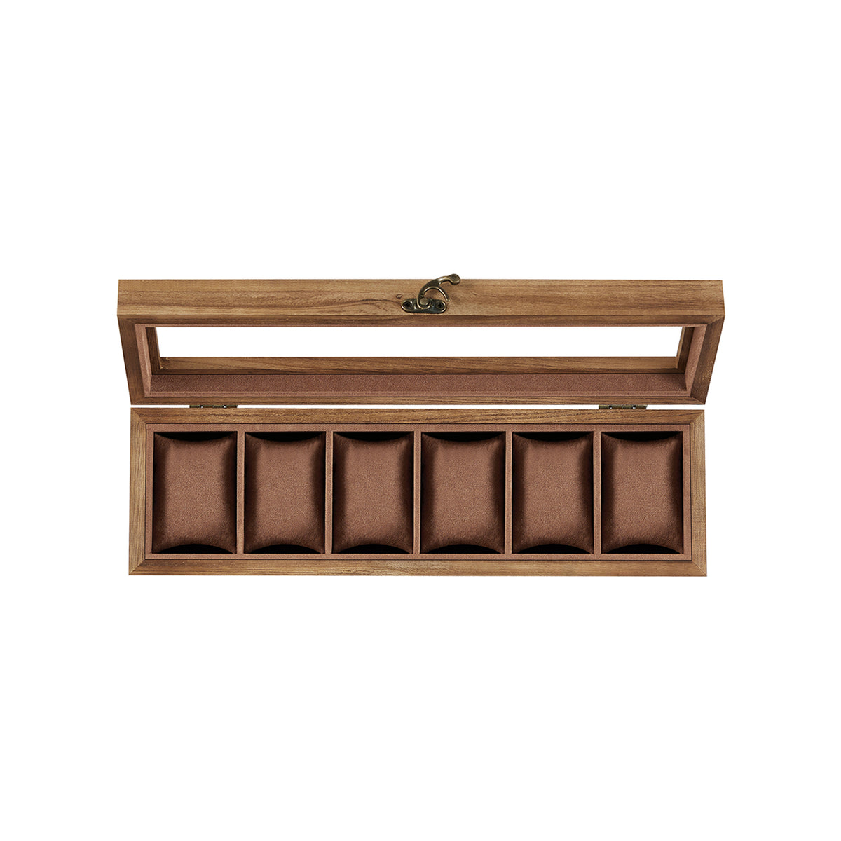Horlogekist 6 vakken van massief hout met glazen deksel walnootkleurig 7 cm