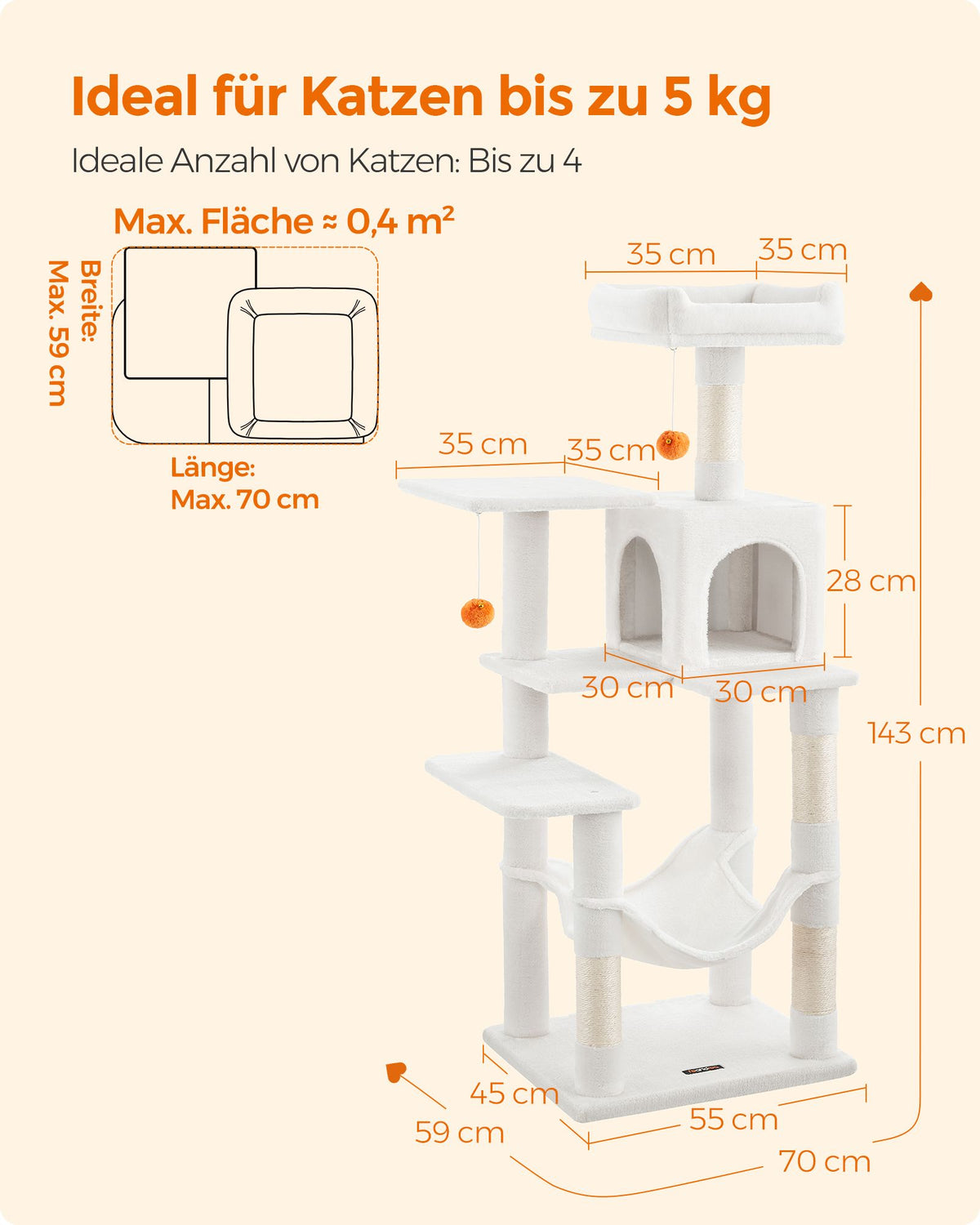 Kattenboom 143 cm hoog met 2 platforms en hangmat crèmewit