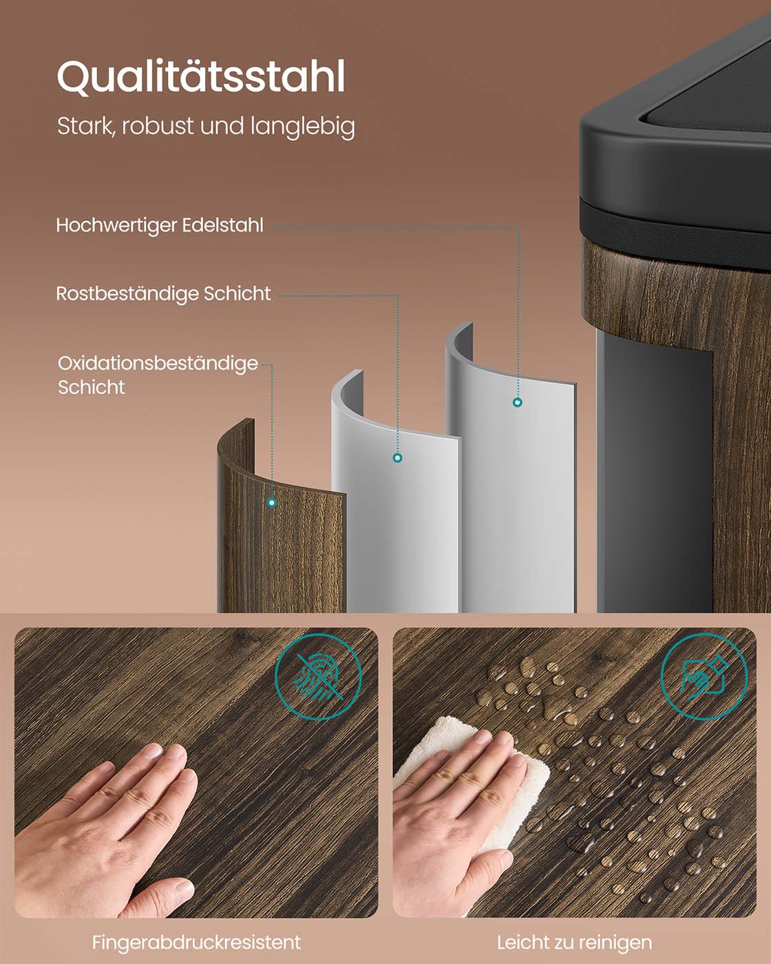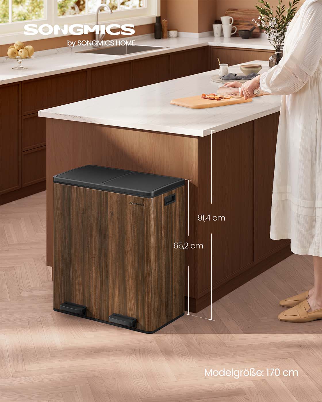 Prullenbak met 2 compartimenten en 15 vuilniszakken, softclose, donker notenhout 2 cm