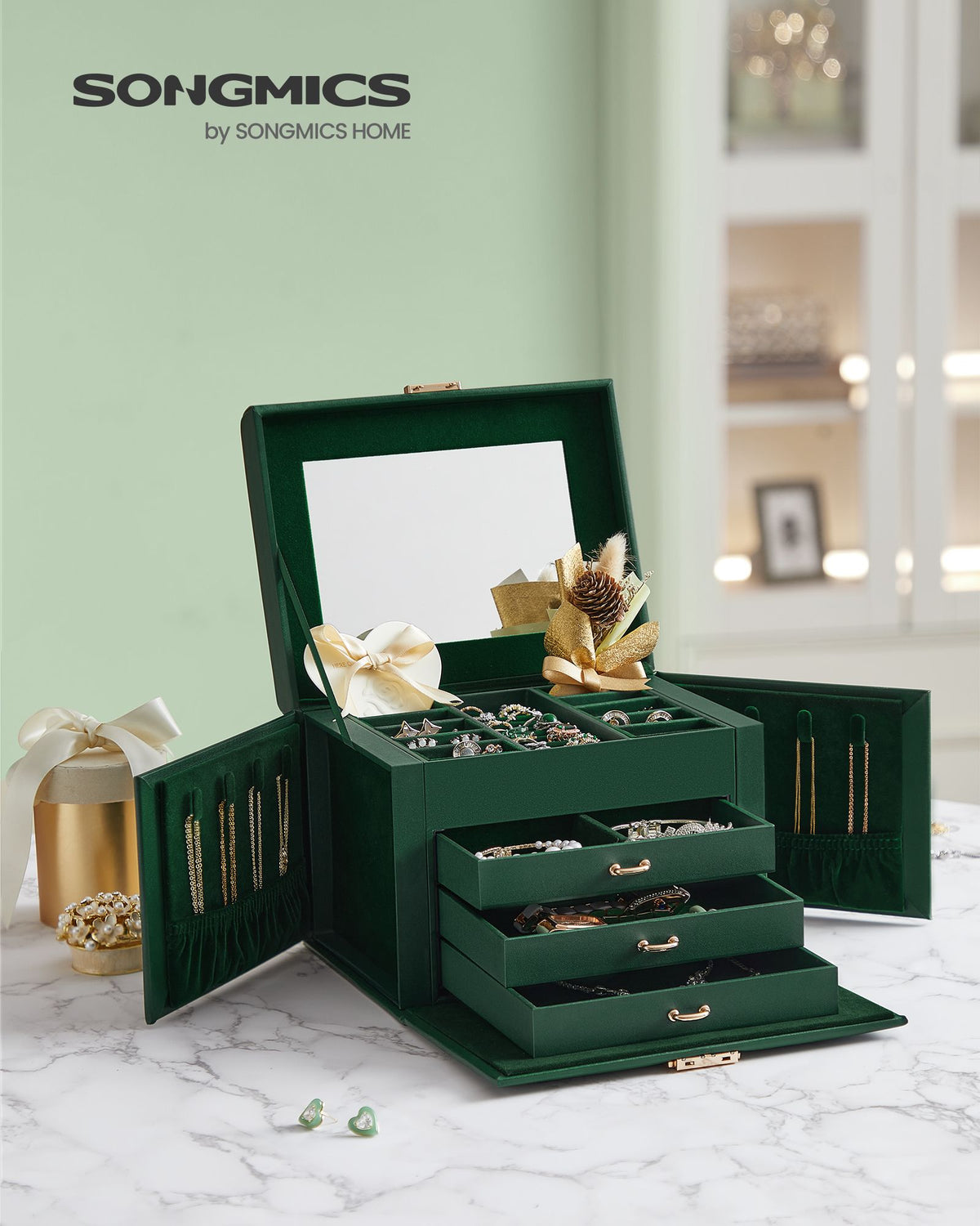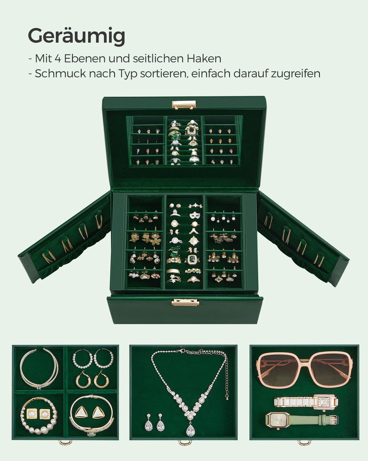 Sieradendoos 4 niveaus met spiegel vintage groen 5 cm - JBC159C01