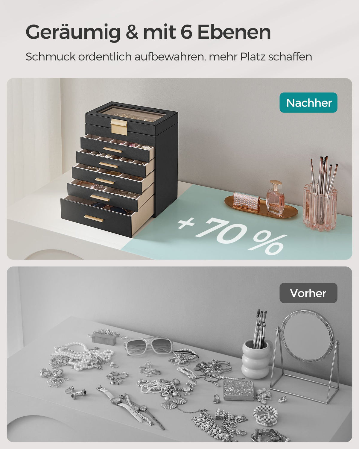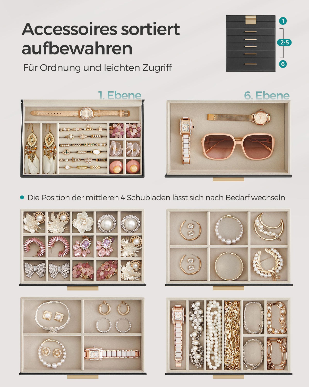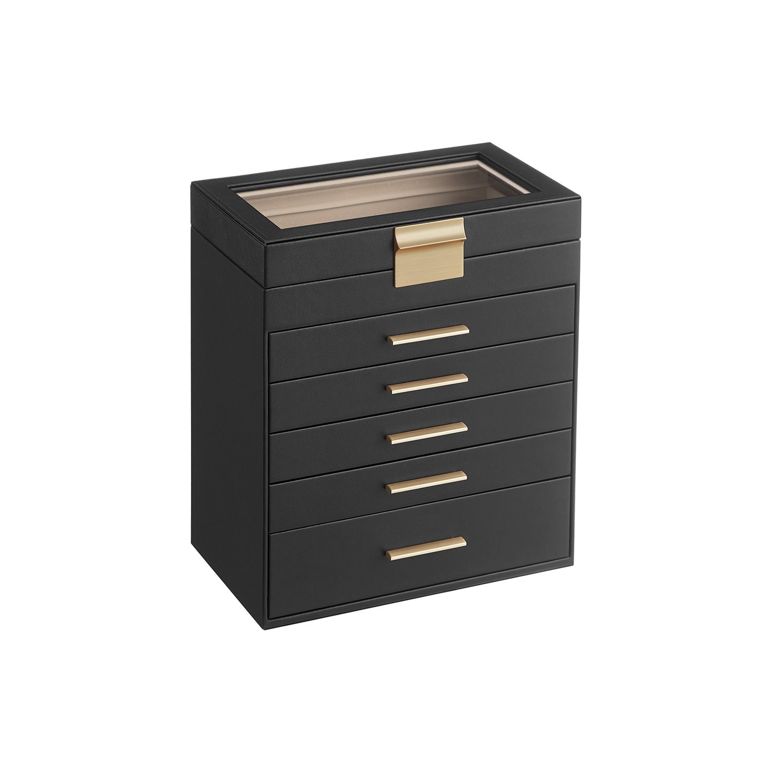 Sieradendoos 6 niveaus met glazen deksel grafietzwart-goud 1 x 29 cm
