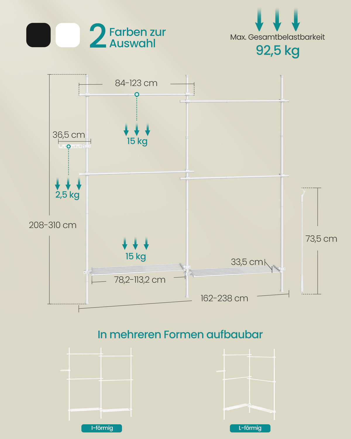 Telescopische kledingroede met 4 stangen en 2 planken mat wit