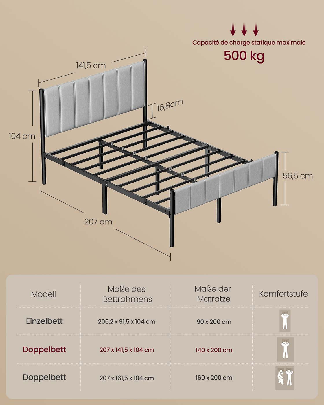 Tweepersoonsbedframe 140 x 200 cm met stalen lattenbodem, duifgrijs