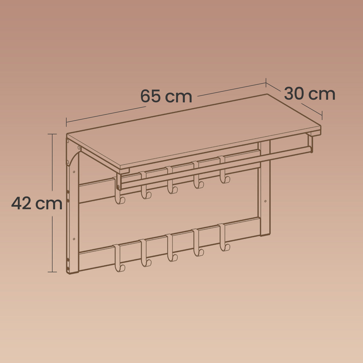 Wandkapstok, met plank, wandplank met 10 afneembare haken 65 x 30 x 42 cm