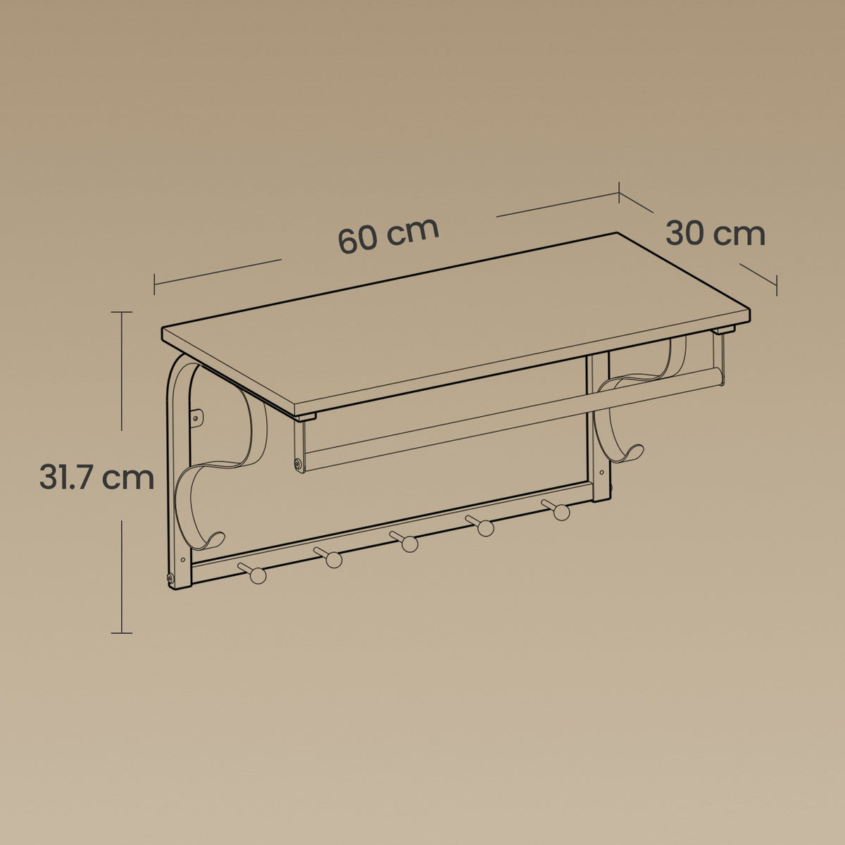 Wandkapstok, wandplank met 5 haken en plank, haakrail met hangstang 60 x 30 cm