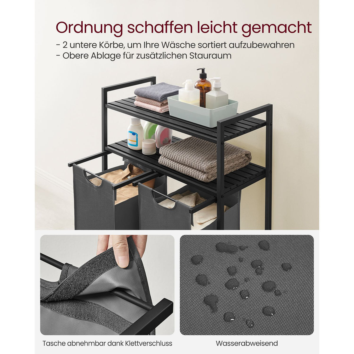 Wasmand 2 x 46 L met 2 planken zwartgrijs 73 x 33 x 91 cm