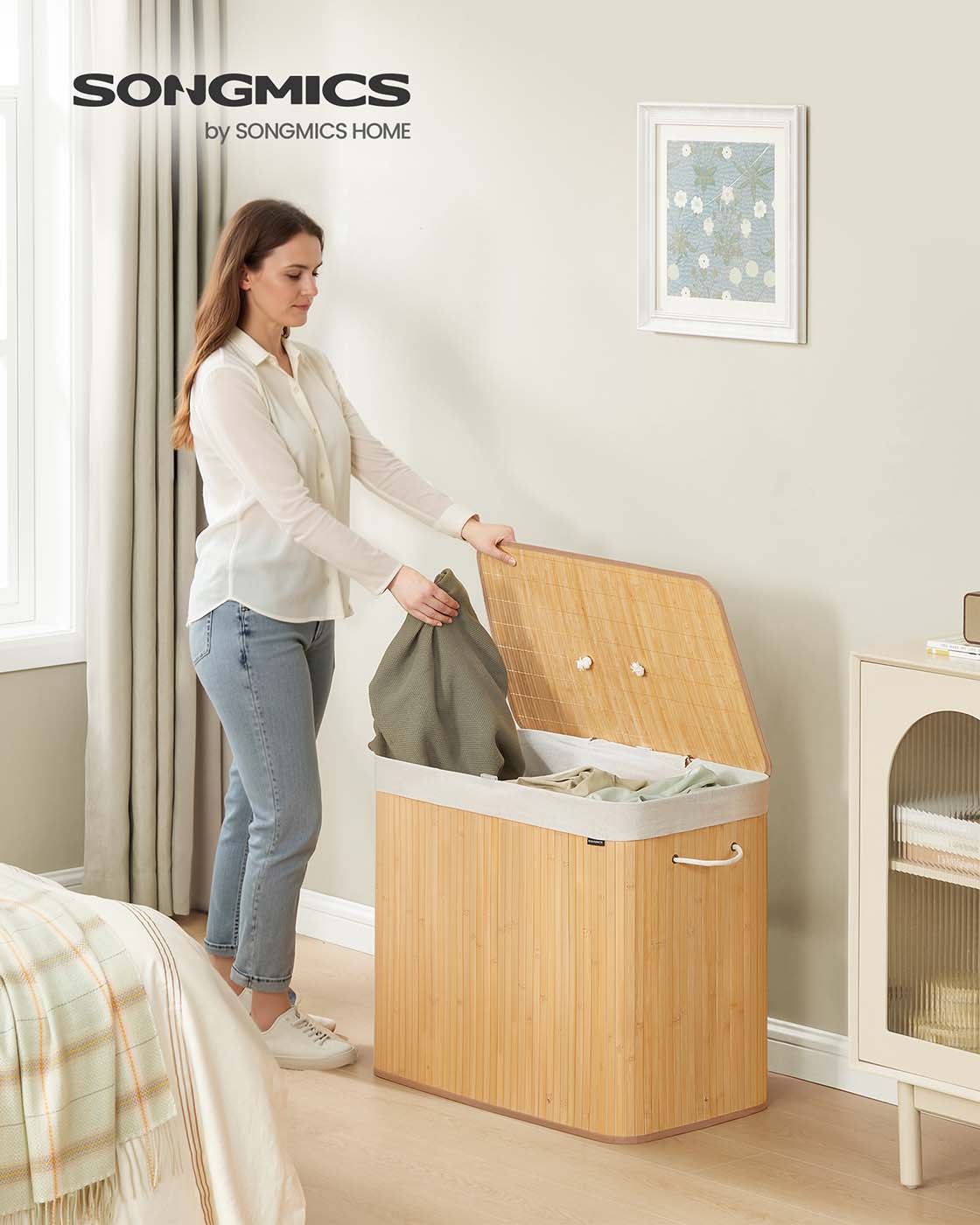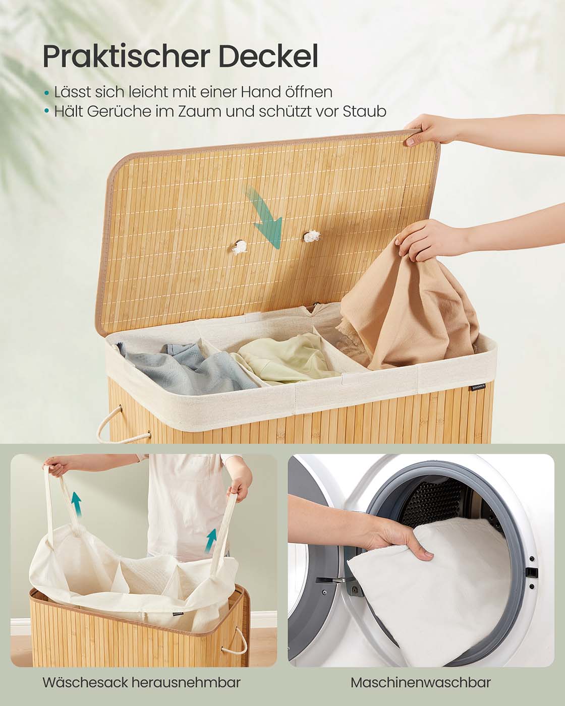 Wasmand met 3 compartimenten en uitneembare waszak, natuurlijke kleuren 40 x 30 x 60 cm