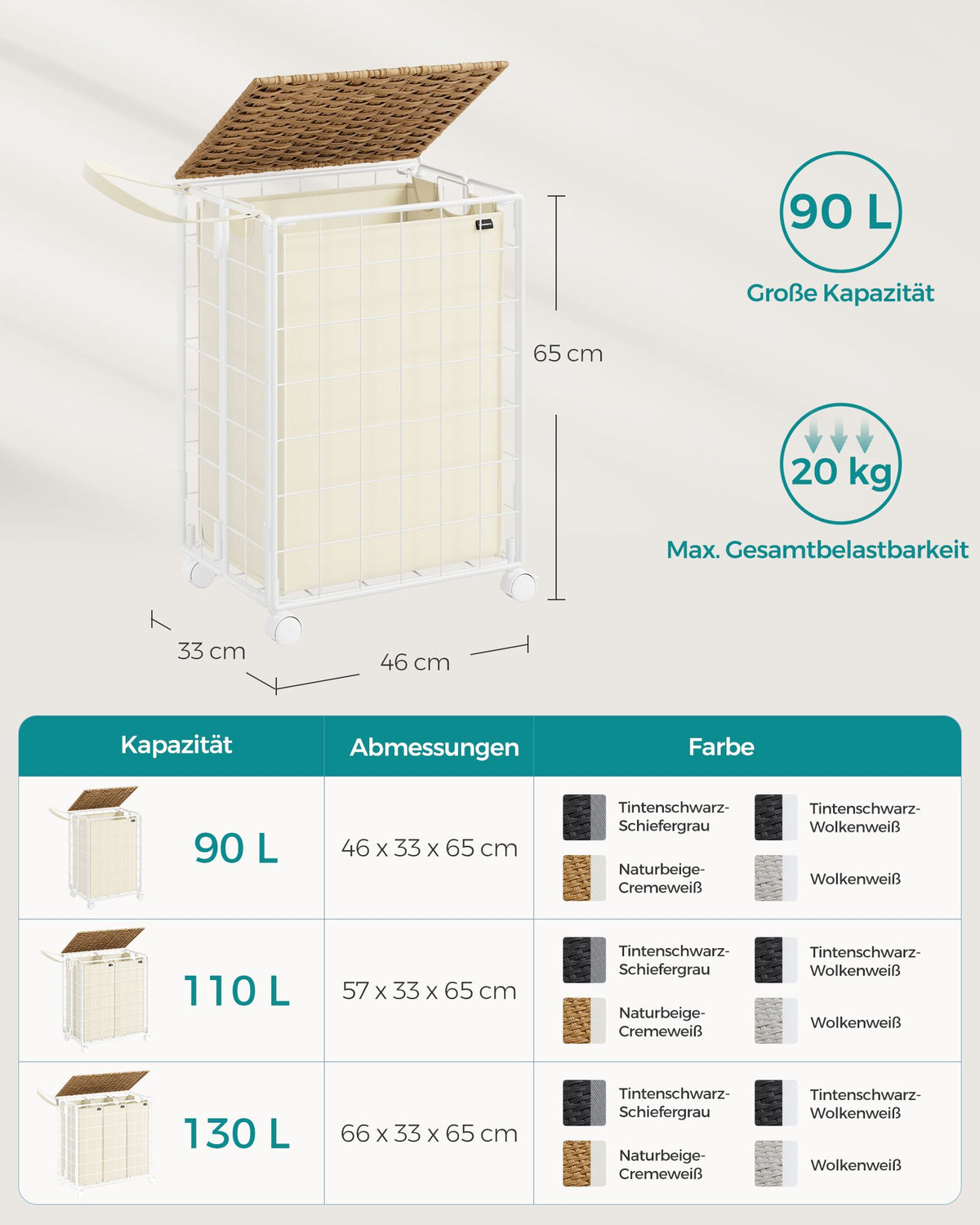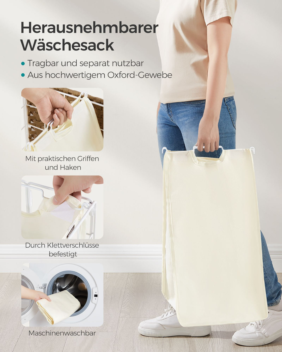 Wasmand met wielen en waszak, naturel beige-crèmewit 57 x 33 x 65 cm