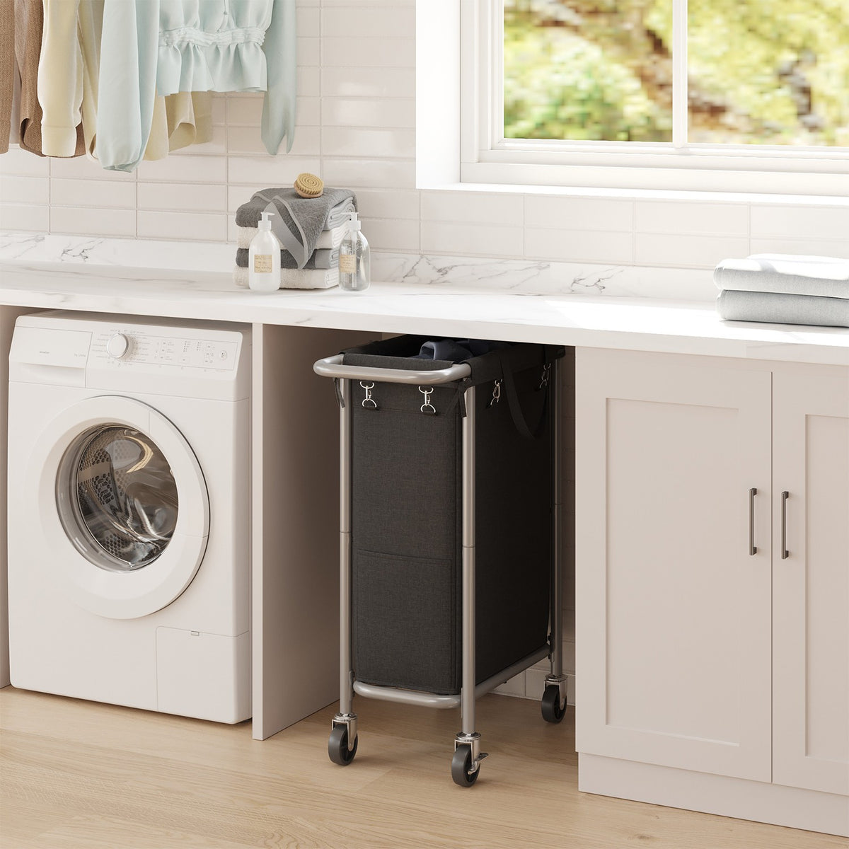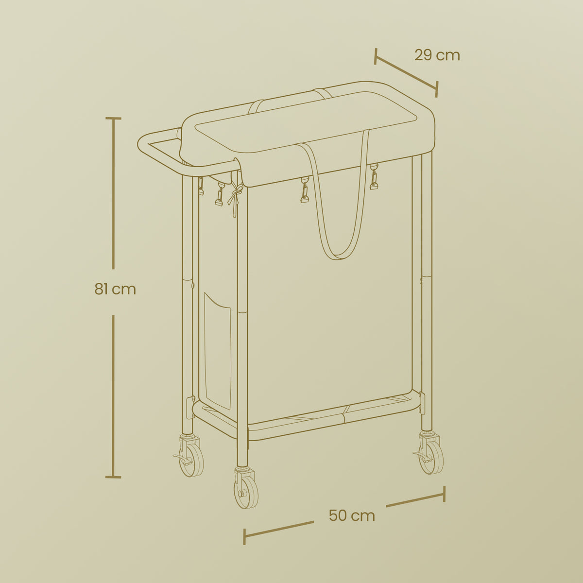 Wasmand met wielen, wasverzamelwagen 2 compartimenten, waswagen 69 x 29 x 81 cm