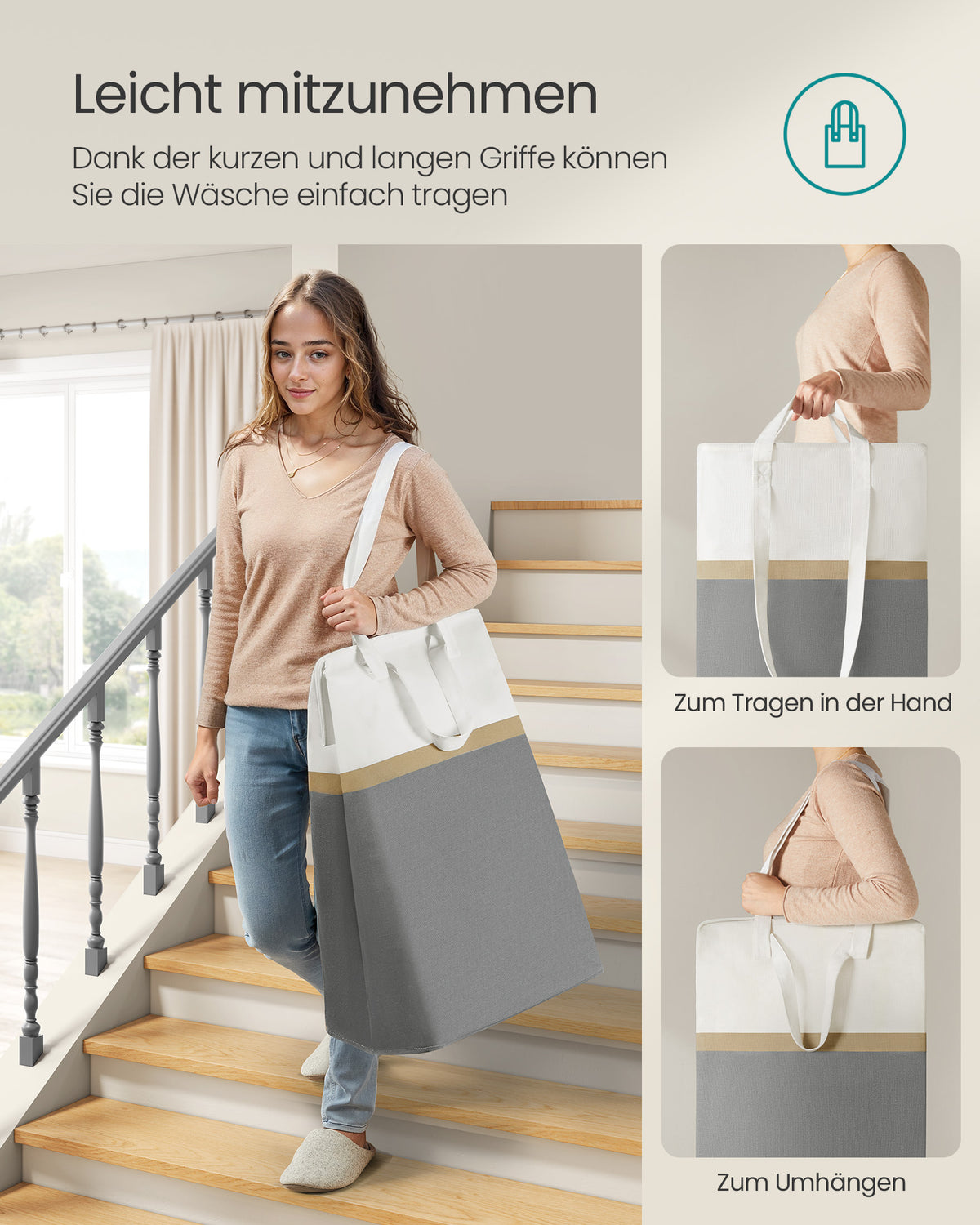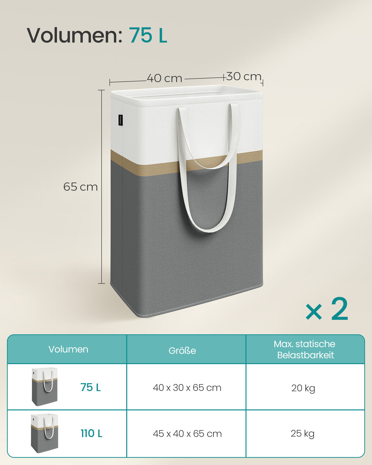 Wasmandset van 2, 75 L, met handgrepen, leigrijs 40 x 30 x 65 cm